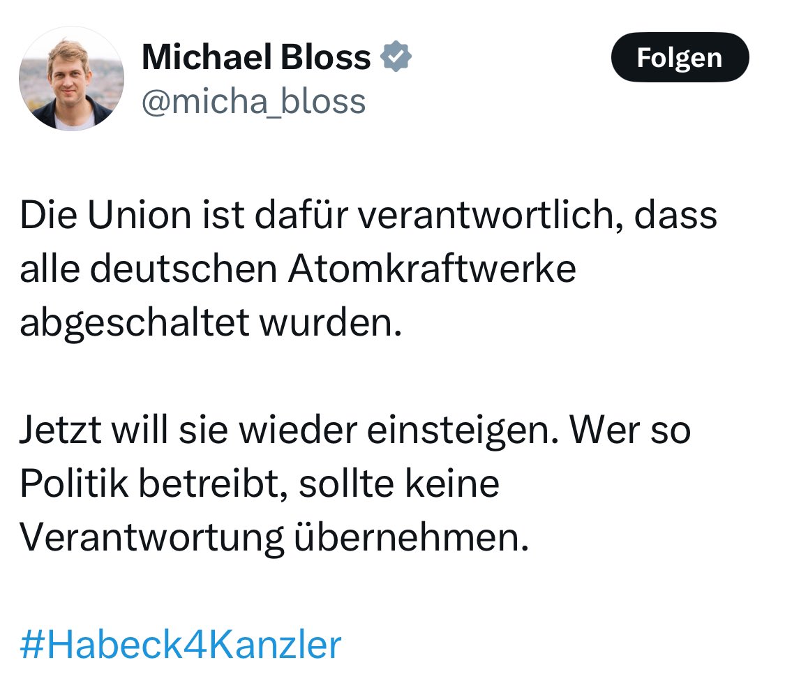 Ohne grüne Angstkampagnen gegen AKW & ohne grüne Illusionen über ihre leichte Ersetzbarkeit durch EE wäre diese Idee nie in SPD und CDU eingedrungen. Ohne Merkels Fukushima-Panik hätten wir wahrscheinlich heute noch ein Dutzend 🇩🇪AKW am Netz. Ohne Habeck wären es noch 6. 4/4