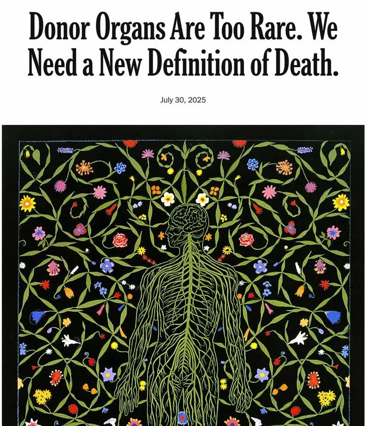 Despite the fact that brain death is not straightforward and significant variations (like not actually being brain dead) are not as rare as they would like to admit, the New York Times recently argued that the definition of death should be broadened even more to meet the increasing organ demand. They want to redefine what life means until the organ supply matches the system’s needs.