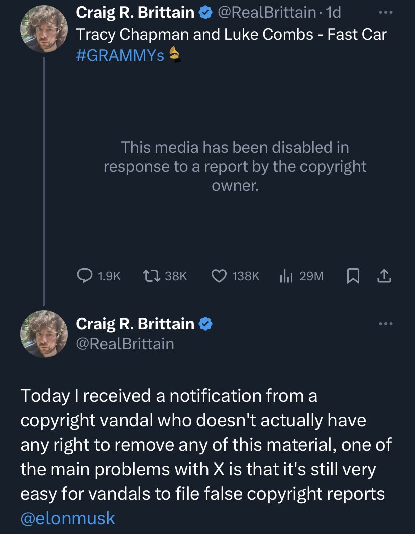 Seems like Elon/Twitter took down the Tracy Chapman "Fast Car" video from the Grammys with 29M views….We need Tracy now more than ever….here’s her "Talkin’ Bout a Revolution" https://t.co/CPmuIEVL98