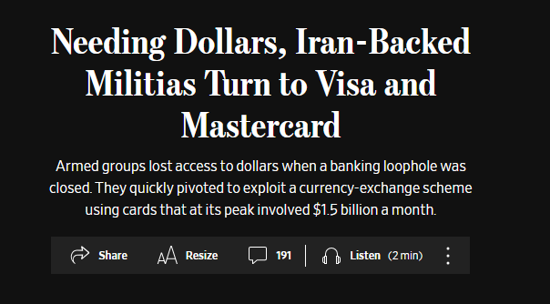 Iranian backed terrorist groups are using Visa and Mastercard to make hundreds of millions a dollars per month. Visa and MC have been advised by US officials what is happening, but they are dragging their feet in fixing it. Visa/MC cash in by making $120 million per year in fees from the terrorists. Other payment networks have an 8x lower fraud rate. Allowing other payment networks to compete in the USA would break the duopoly that Visa and Mastercard have on our market. It would also save the average family $1,100 per year in hidden swipe fees. Europeans have much more competition in for payment networks, and pay a fraction in swipe fees compared to Americans.