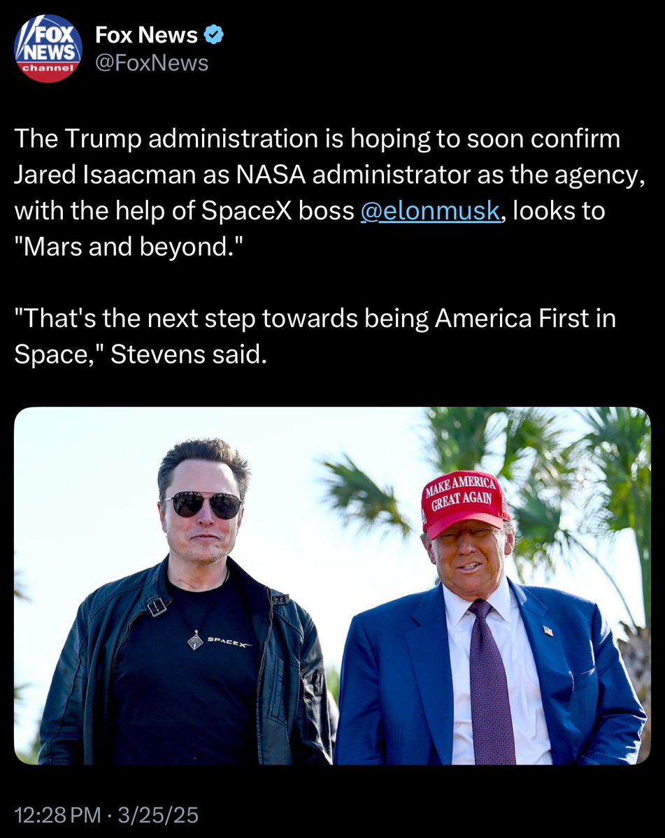 President Trump is going to be the first world leader to put a human on Mars. And he’s going to do it with the help of Elon Musk and Jared Isaacman, the next NASA chief 🔥🔥🔥🚀 https://t.co/N6xzKU9lOw