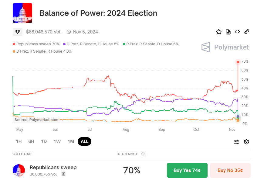 Polymarket numbers on a Republican sweep of the Senate, House and the Presidency just reached 70%. Highest ever ... https://t.co/z2xWUNFaf2