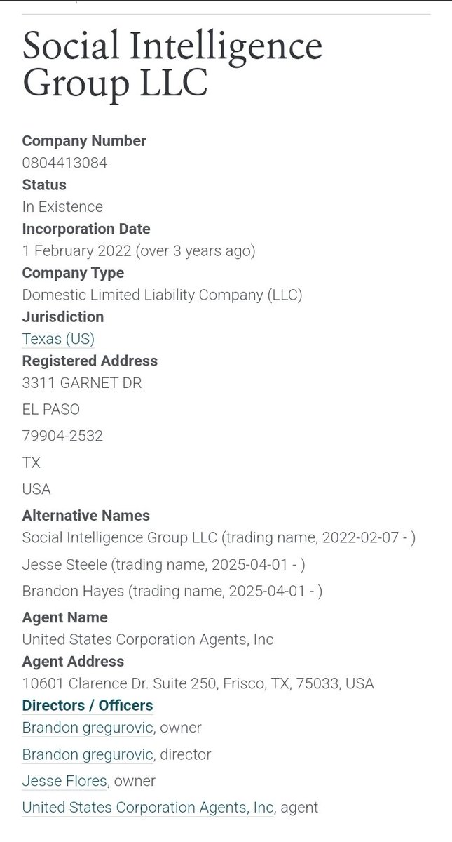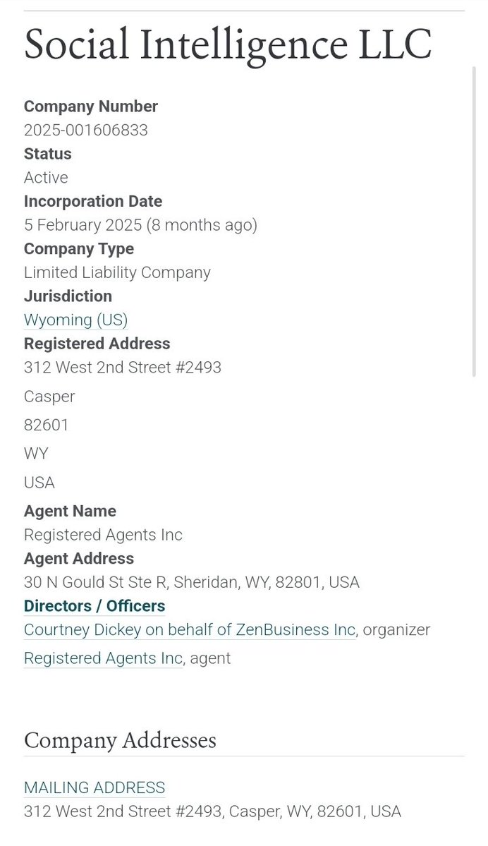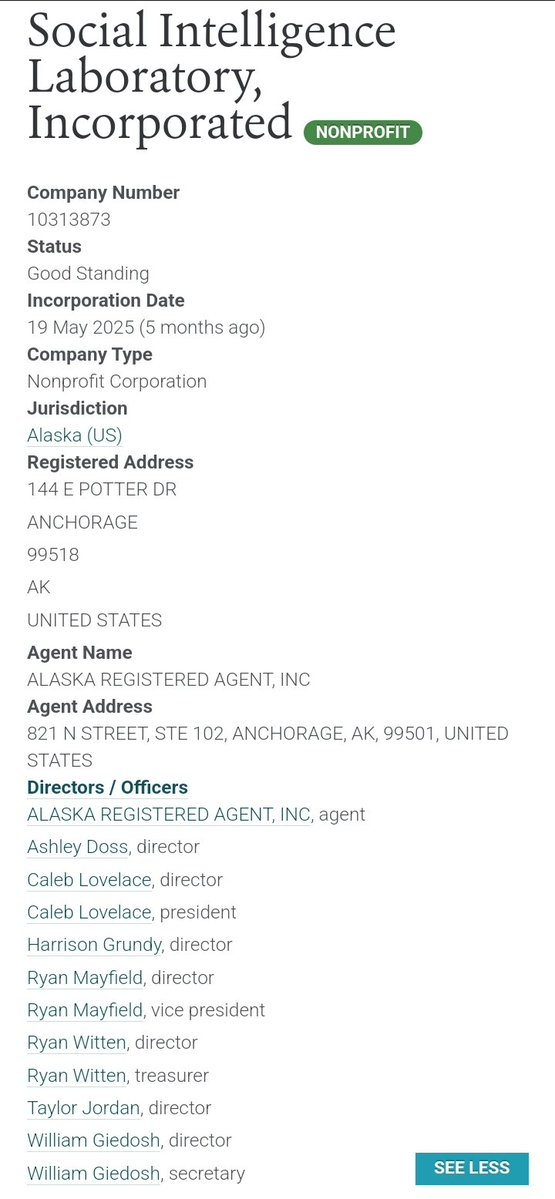 The Social Intelligence Lab (UK) Jillian Ney 'Laboratory' (AK) 5 months ago 'Social Intelligence' (WY) 8 months ago Social Intelligence Group (TX) Check out how intelligent they were with their names. Jesse ? Brandon ? https://t.co/31mcn3T49t