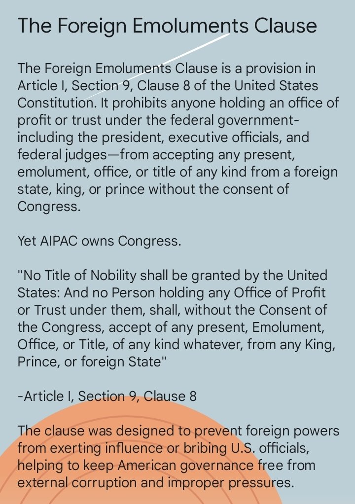 @JustTheHound @SloanRachmuth @FBIDirectorKash @FBIDirectorKash 🫡 Here's another one for @SloanRachmuth aside from http://Efile.fara.gov The Foreign Emoluments Clause is found in Article I, Section 9, Clause 8 of the United States Constitution. https://t.co/MxGowFSNyW