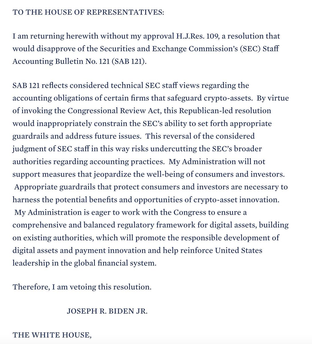 BREAKING: ๐บ๐ธ President Biden vetoes bill that allows highly regulated financial firms to hold #Bitcoin and crypto. https://t.co/qRWC2myigR