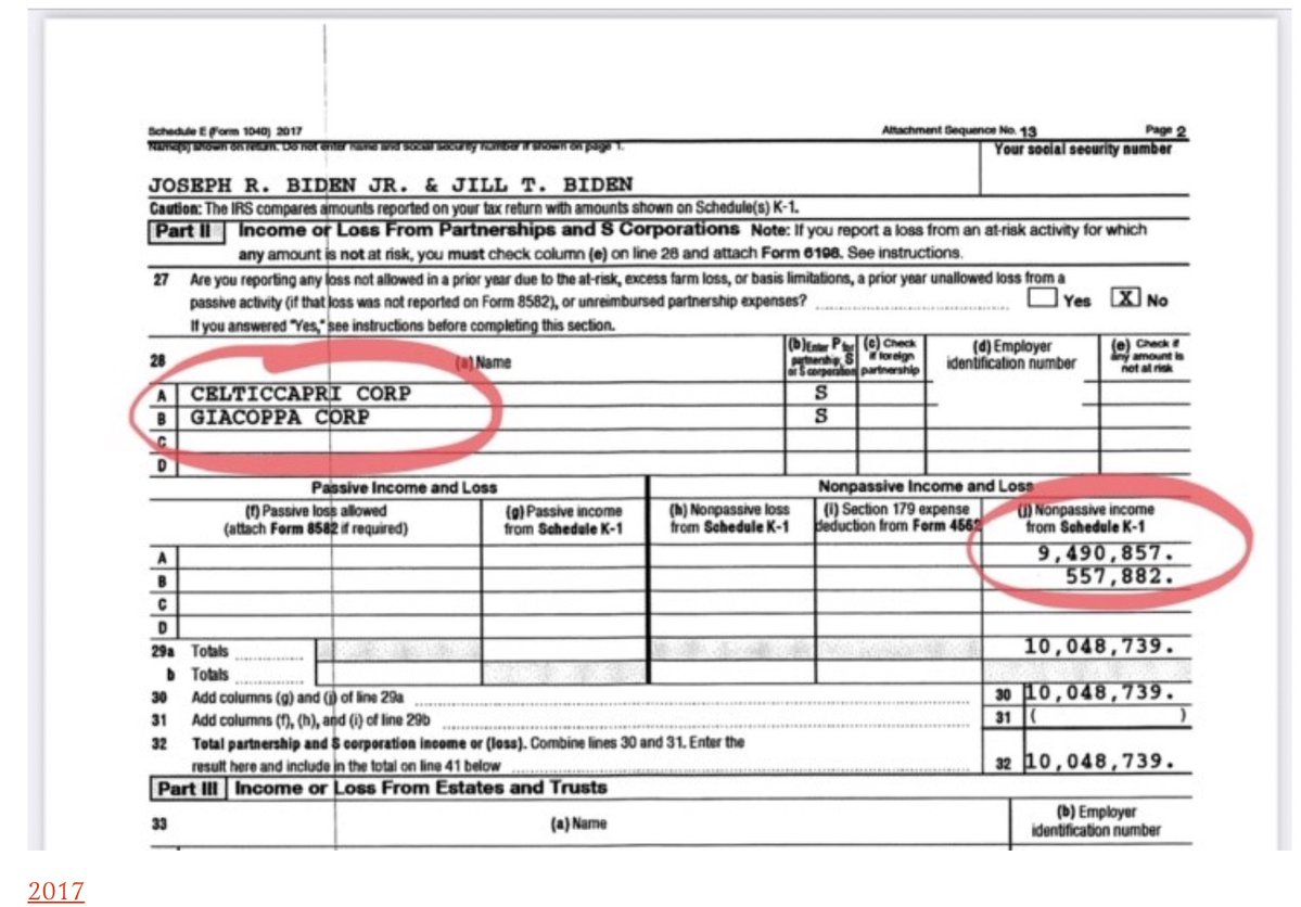 Biden could be hiding his alleged $5M payment from Bursima in his entity "CelticCapri" & Jill Biden's entity "Giacoppa Corp" The numbers below in his 2017 tax return don't provide revenue line items accounting for about $10M Joe Biden must disclose who paid him & for what