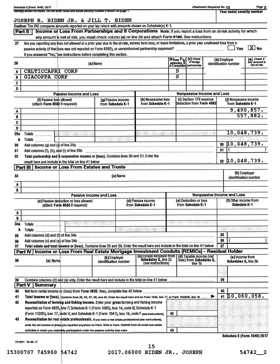 Joe Biden could be hiding his alleged $5M payment from Bursima in his entity "CelticCapri" & Jill Biden's entity "Giacoppa Corp" The numbers below in his 2017 tax return don't provide revenue line items accounting for about $10M Joe Biden must disclose who paid him & for what
