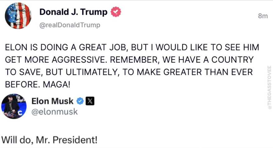 🚨ELON AND TRUMP ON “WHAT DID YOU GET DONE LAST WEEK” EMAIL: ELON: "Last week the president encouraged me on Truth Social and also a by phone call to be more aggressive. And I was like, okay, yes sir, Mr. president, will we do that. The president is commander in chief. I do what the president asks." "I said, can we send out an email to everyone just saying wants to get on. But last week the president said yes. So we did that." "We wish to keep everyone who is doing a job that is essential and doing that job well. But if there if the job is not essential or they're not doing the job well, they obviously should not be on public pay." TRUMP: "I'd like to add that those million people that haven't responded, though, we learned they are on the bubble. You know, I wouldn't say that we're thrilled about it. You know, they haven't responded. Now, maybe they don't exist. Maybe we're paying people that don't exist." "But those people are on the bubble, as they say. They may be they're going to be gone. Maybe they're not around. Maybe they have other jobs. Maybe they moved and they're not where they're supposed to be. A lot of things could have happened. I wouldn't say that Biden ran a very tight administration. They spent money like nobody's ever spent money before."