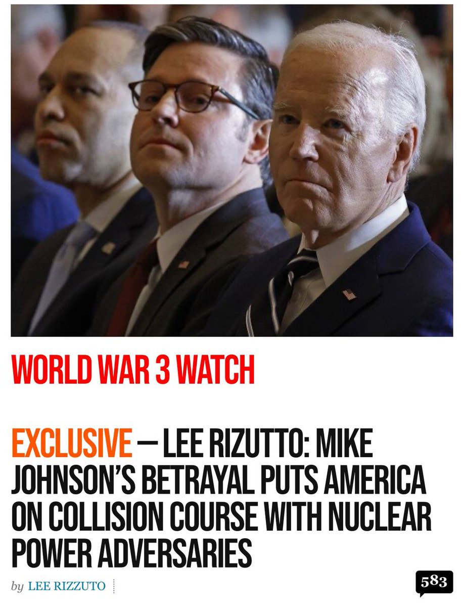 Republican Speaker of the U.S. House of Representatives Mike Johnson is joining with the Democrat minority to pass a supplemental spending package of foreign aid without the will or consent of the Republican House majority elected by the people of our country. He brazenly pushed through a “rule” to establish guidelines that essentially rigged the vote before it even takes place on Saturday, setting up what is likely inevitable passage of this spending package. This spending bill is not like any other we’ve seen. https://www.breitbart.com/politics/2024/04/20/lee-rizutto-mike-johnsons-betrayal-puts-america-collision-course-nuclear-power-adversaries/