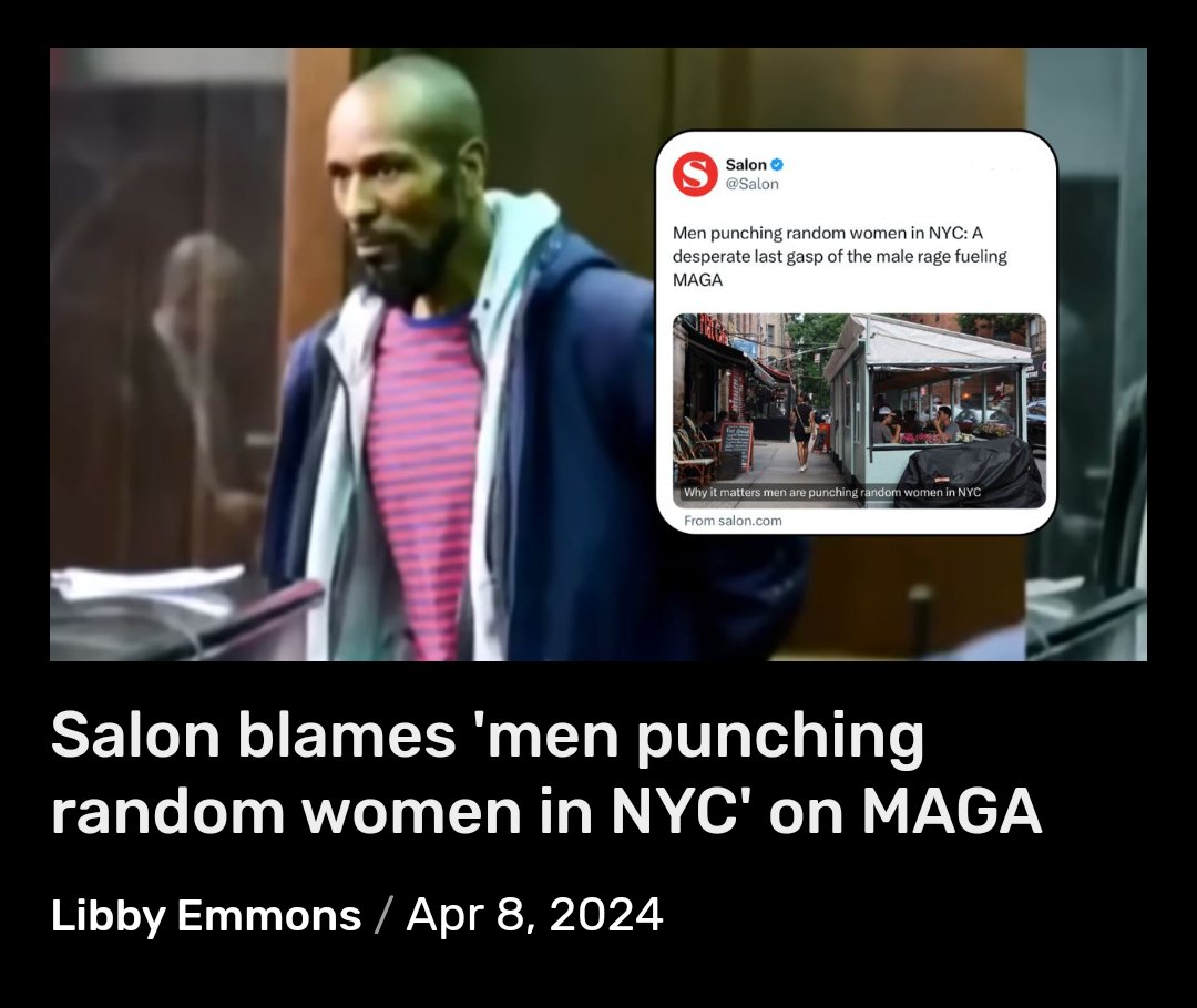 A new article out from Salon puts a wild spin on the recent phenomenon of strange men punching women in the face randomly on the streets of New York: they blame MAGA. The headline reads "Men punching random women in NYC: A desperate last gasp of the male rage fueling MAGA." The claim from writer Amanda Marcotte is that the random attacks "are an extreme manifestation of men feeling entitled to women's time and attention." Stephanie Weng was attacked near Manhattan's Union Square by "a creep spotted in a 'Lilo & Stitch' sweatshirt," the New York Post reports. The man punched Weng in the face. There have been additional accounts, and none of them have been linked to right-leaning political motivations. Ashley Cruz was hit in the face by a man on 6th Avenue and 14th Street. Skiboky Stora has been arrested for punching one woman. He went on to represent himself in court and is "a criminal recidivist with an extensive criminal record." He is also the great-great-grandson of civil rights activist Marcu Garvey. "He is a frequent candidate for elected office and performing artist who records rap music under the name Designer Attitude," the Post states. Malliak Miah was arrested as well and charged with assault after he was suspected of punching a woman in the face in Greenwich Village. Other attacks have been reported to police. That's totally irrelevant to Salon, however, which claims that the women "were just living their lives, and that, it seems, is what enraged their assailants." Marcotte brings the attacks back to the complaint that men are enraged by women who don't pay attention to them. "These stories resonate," Marcotte writes, "as well, because the nation is having a moment of increasingly unhinged male fury at women for daring to have lives that are centered around something other than catering to a man's every whim. Unleashed by Donald Trump and the MAGA movement, there's an upswell of loud male entitlement shouting at us from every corner." Marcotte then links it all back to Jordan Peterson, "trad wives," Ben Shapiro, and "backlash" against feminism. And who does Salon blame for all that? Young, male Trump voters, not criminals. "The rise of MAGA is fueled by misogyny. But it's less a backlash than a tantrum, a rage explosion by men who want to restore their dominance but fear that, this time, women won't buckle to their bullying. This rash of men punching women in New York City captures this moment in a dark way," Marcotte writes. As to who is actually to blame for the direct, violent, real life attacks on women? That, she says, is irrelevant. "We don't even need to know their names or faces to know that men who do this are losers, lashing out because they've learned that actually, women don't owe them anything just because they're men." Marcotte, of course, doesn't know anything about the men suspected in these attacks. She only knows that they are men and that is enough for her to label them with the most vile of all labels: MAGA. https://thepostmillennial.com/salon-blames-men-punching-random-women-in-nyc-on-maga