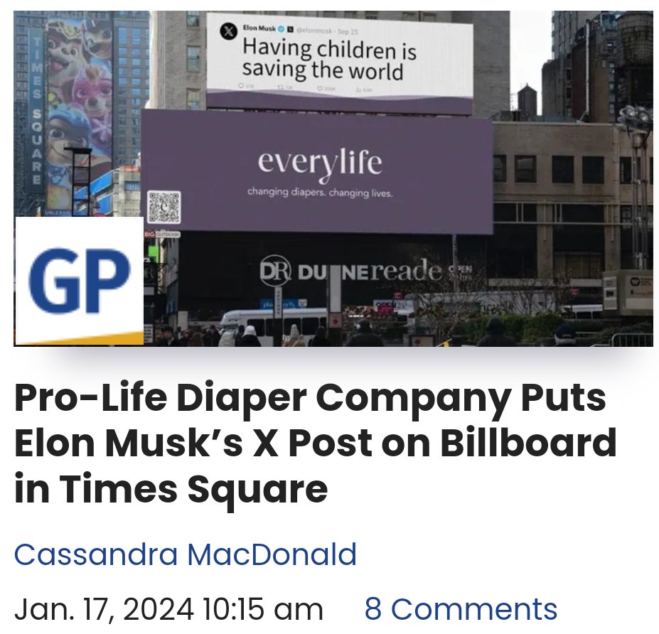 A pro-life diaper company has put one of Elon Musk’s X posts on a billboard in Times Square. The company, EveryLife, unveiled the billboard on Wednesday as part of its “Make More Babies” campaign. The campaign is meant to coincide with Saturday’s March for Life in Washington, D.C. The double billboard begins with a post from Musk in September: “Having children is saving the world.” The second billboard, just below the first, reads “EveryLife” and “changing diapers. changing lives.” According to a report from Fox Business, “The ad will run 30 minutes straight on Wednesday and have regular appearances over the next five days.” A video ad will also run, taking aim at “population control ideologies,” such as climate change activists who have become increasingly anti-natal. “There’s a profound need for more children in the world, and EveryLife is here to take a bold stance that we disagree with population control ideologies,” EveryLife co-founder and president Sarah Gabel Seifert said in a statement to Fox. “Our ‘Make More Babies’ campaign isn’t just about promoting our brand — it’s a powerful affirmation of our core conviction that every child is a gift, deserving love, protection, and support. No other diaper company will speak out and say the same.” The report added, “the diaper and wipes company launched in July 2023 as a direct-to-consumer baby brand. According to its website, pro-life organizations and nonprofits can receive a 25% discount on its products.” EveryLife’s website states, “We started EveryLife with a simple mission – to create clean, premium baby products that protect and celebrate every miraculous life.” “We unapologetically choose to celebrate life,” the company continued. “Because every child is a gift from above that deserves to be loved, protected, and celebrated — every single day. And our community will be just that: men and women who are joyful about raising children, celebrating life, and championing parenthood. Whether you’re in the trenches of raising little ones, hoping to have kids soon, or watching your own children become parents, you belong here.” https://www.thegatewaypundit.com/2024/01/pro-life-diaper-company-puts-elon-musks-x/