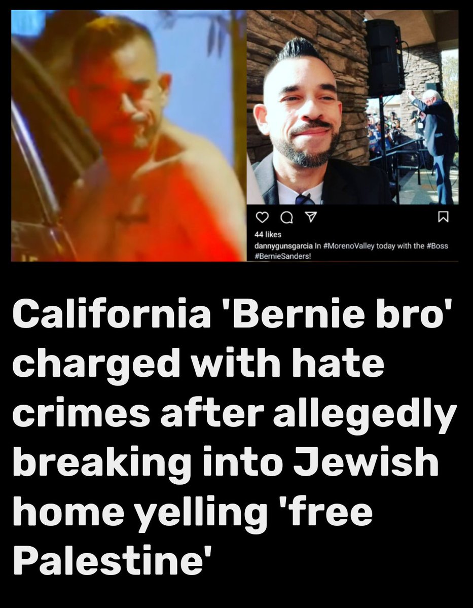 A man wearing just underwear broke into a Los Angeles home and threatened to kill the Jewish family living there on October 25. He was later was arraigned Monday in the Van Nuys Courthouse. Daniel Garcia's social media shows that he was an avid supporter of Bernie Sanders, Gavin Newsom, and believes that Israel's governance is akin to that of Nazis. He is currently being held on $125,000 bail. On October 25 at approximately 5:20 am, Garcia attempted to enter the victim’s home by kicking in the door while shouting antisemitic slurs including threatening to “kill Jews!” He was caught on camera shouting "Free Palestine" and "brown people matter.” Los Angeles County District Attorney George Gascón announced that Daniel Garcia has been charged with threatening to kill a Jewish family in their home during the antisemitic attack. He was a field organizer for Bernie Sanders' presidential campaign in 2019 and a grassroots organizer for the 2016 campaign. He worked as a volunteer to gain universal healthy care in California, worked on Tulsi Gabbard's 2020 presidential campaign as a volunteer, and also with the Environmental Justice Advisory Committee wiht the California State Assembly. Daniel Garcia (front left) holds Bernie sign Daniel Garcia on the campaign trail for Bernie Sanders Gascón said of Garcia, “We unequivocally denounce the violent act committed against an innocent family in our community. This act, fueled by hate and antisemitism, has no place in our society, and we condemn it in the strongest terms possible." “Our commitment to protecting and defending all residents of our community is unwavering. Acts of hatred that threaten the safety and security of our families will not be tolerated.” “We will provide support and justice, leaving no room for intolerance to thrive. Those who spread hatred will face the full force of the law.” Garcia is charged with three felony counts including one count of criminal threats, one count of attempted first-degree residential burglary, and one count of vandalism $400 or more in damage or destruction or property. Also, Garcia allegedly committed hate crimes in violation of Penal Code Section 422.75. If convicted as charged, Garcia will face a maximum sentence of seven years and four months in state prison. https://thepostmillennial.com/california-bernie-bro-charged-with-hate-crimes-after-allegedly-breaking-into-jewish-home-yelling-free-palestine