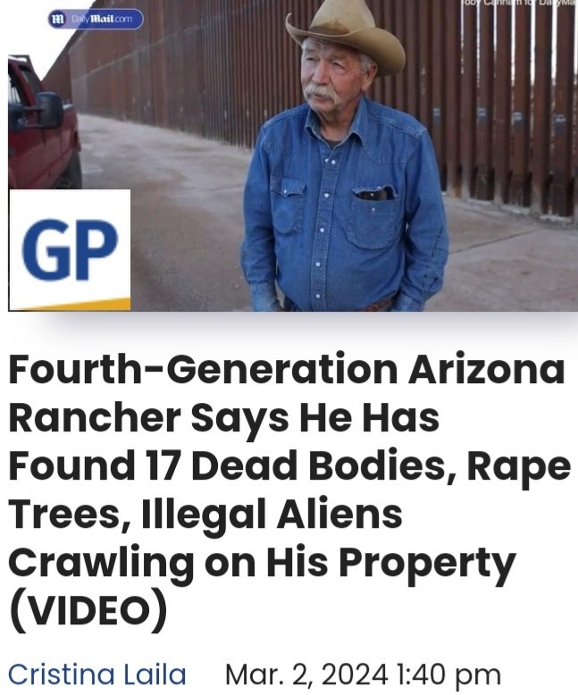 Joe Biden’s America. A fourth-generation Arizona rancher who owns 1,600 acres of land that spans 10.5 miles along the southern border said he has found 17 dead bodies, rape trees, and illegal aliens crawling on his property. John Ladd, 68, has been outspoken about Biden’s border crisis over the years. He described what it’s like to live on the border under the Biden Regime which openly favors the illegal invaders and punishes American citizens. “That’s a rape tree,” Ladd told The Daily Mail, pointing to a tree on his property covered with women’s underwear, which cartel smugglers use as ‘trophies.’ “Almost all the women who come across get raped by their guides, who then throw their underwear in the trees,” he added. Ladd carries a firearm at all times to protect his property and cattle. His family has kept up the ranch for 127 years. “I’m in favor of having American citizens and private property owners have more control over their destiny. That’s the bottom line,” Ladd said. Ladd told the Daily Mail of the invaders: “They’re military-age males in camouflage, Balaclavas and a cell phone. They don’t want to get caught.” The Daily Mail reported: John Ladd’s phone is an archive of life on a ranch beside the Arizona border with Mexico. Ladd, 68, has been a rancher all of his life. In the past 30 years he has learned about such savage displays, as well as the patterns of migrants who cross the border and the cartels who control turf on the other side. His 16,000 acres lie in the busiest part of the entire border. Border Patrol agents in the Tucson sector recorded 250,000 apprehensions in just the first four months of the fiscal year — almost a 200 percent increase on last year. His family has kept cattle here for four generations or 127 years. These days he keeps count of the dead bodies he has found on his land — 17 in total (not counting those found on the 60ft strip of federal land at the border). They are migrants who succumbed to the desert heat in summer or the cold in winter or whose hearts gave out or the victims of violence. One Arizona rancher who decided to defend his wife and property from illegal invaders was arrested and charged with second-degree murder and aggravated assault. George Alan Kelly, 74, was arrested for killing Gabriel Cuen-Butimea, on his Arizona ranch in Kino Springs just outside of Nogales, Mexico on January 30, 2023. According to reports, Gabriel Cuen-Butimea has a history of illegally crossing into the United States and multiple deportations. According to the defense lawyers, Mr. Kelly fired warning shots after he saw a group of men dressed in camouflaged clothing point an AK-47 right at him. George Alan Kelly was careful to shoot above their heads, the lawyers said. The rancher later discovered the deceased illegal alien, who is likely a cartel smuggler, when he went to go check on his horse. Kelly was initially charged with first-degree murder, but a judge recently downgraded his charge to second-degree murder during an evidentiary hearing in court. https://www.thegatewaypundit.com/2024/03/fourth-generation-arizona-rancher-says-he-has-found/