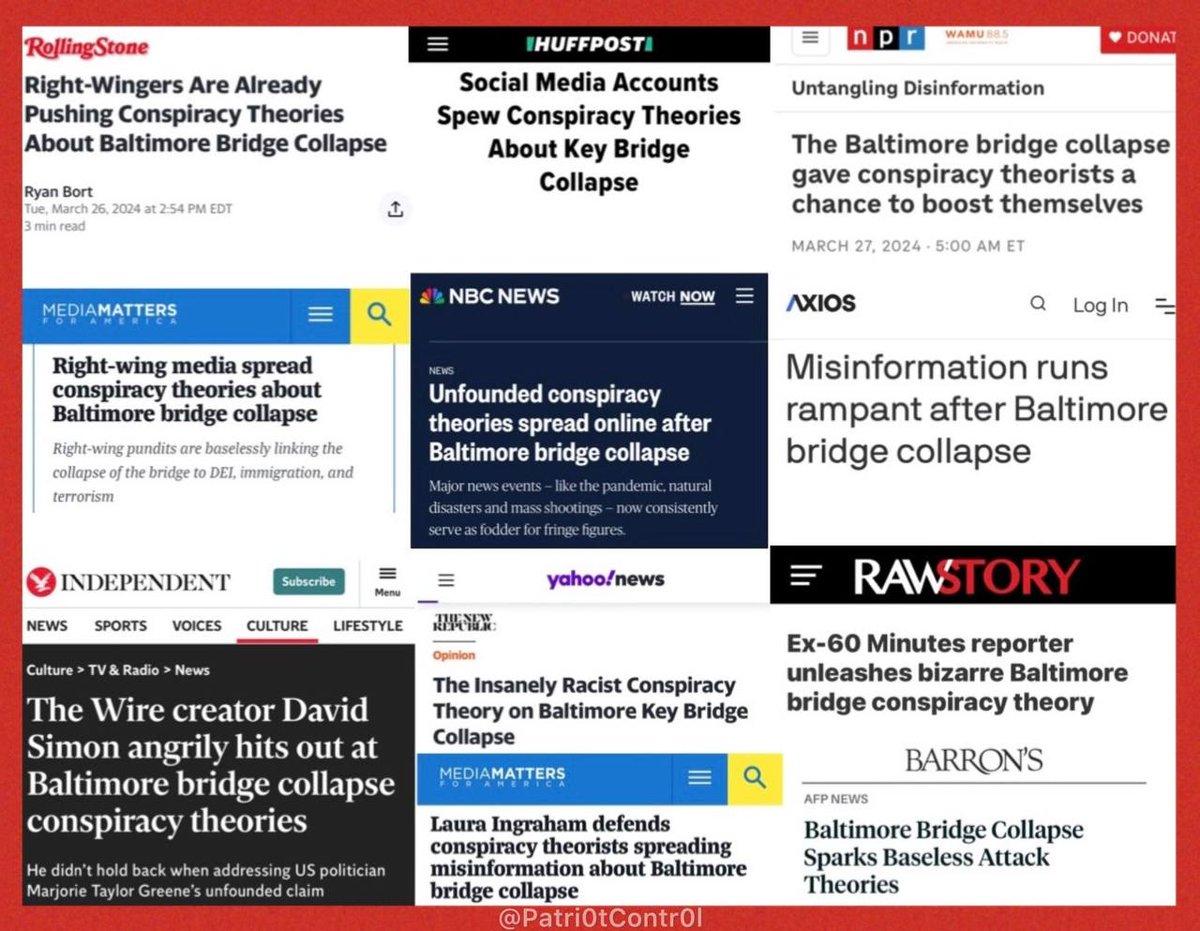 Fake News, in unison, labeling anyone who has questions about the Baltimore bridge collapse a right-wing conspiracy theorist spewing baseless misinformation. Isn’t it interesting how it’s only been 1 day and they already have all the answers? No investigations needed! https://t.co/7cx5zT2Ovf