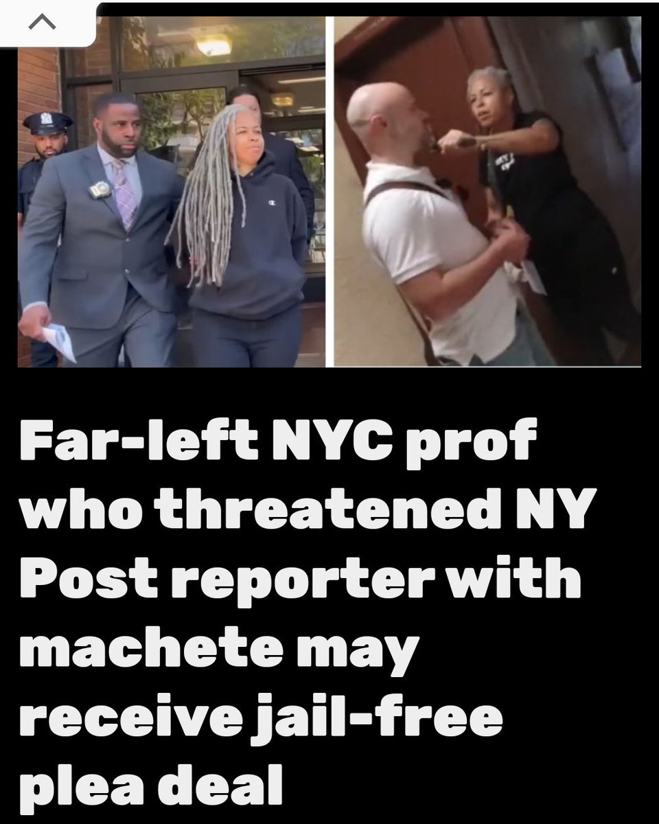 WHAT A SHOCKER...A LEFTIST TERRORIST MAY GET NO PUNISHMENT. A plea agreement may be offered to the former New York City woke college professor who caught the nation’s attention after she threatened to ‘chop’ a New York Post reporter with a machete in May. This potential deal, of which the details have not yet been revealed, is a possibility thanks to discussions with prosecutors at the Bronx Criminal Court. Shellyne Rodriguez, 46, could be seen showing up to the hearing with a black face mask as well as a personal posse that attempted to block photographers from capturing pictures. According to Bronx Criminal Court Judge Matthew Bondy, there is a “possible disposition” in the case. She faces charges of harassment and menacing after she was seen threatening and chasing reporter Reuven Fenton with a machete, according to the New York Post. “If I see you on this block one more f*cking time, you’re gonna …,” Rodriguez yelled at Bondy at the time, according to The Post. “Get the f*ck off the block! Get the f*ck out of here, yo!” The judge extended the orders of protection ordering Rodriguez stay away from Fenton, as was requested by the prosecution. The Bronx District Attorney’s Office reportedly satiated on Monday that it had not yet “determined nor communicated a plea offer” to Rodriguez or her legal representation. “We are reviewing information sent by defense counsel, continuing our investigation, and keeping the victim apprised of any developments,” stated a DA spokesperson. The infamous machete incident aside, there are other instances where Rodriguez has captured attention for alleged public disturbances. At one point, she lost her temper in public after she saw a pro-life student group tabling at a college. Rodriguez was a professor at the time. “You’re not educating sh*t. This is f*cking propaganda,” she yelled at the students in May. “What are you going to do like anti-trans next?” She said the students are not “educating sh*t,” and suggested that their actions are “bullsh*t,” "violent,” and are “triggering” her students. She then appeared to vandalize the students’ literature https://thepostmillennial.com/far-left-nyc-prof-who-threatened-ny-post-reporter-with-machete-may-receive-jail-free-plea-deal
