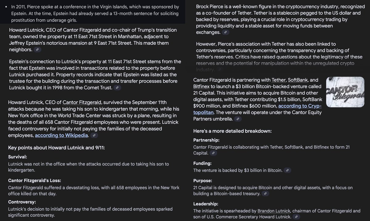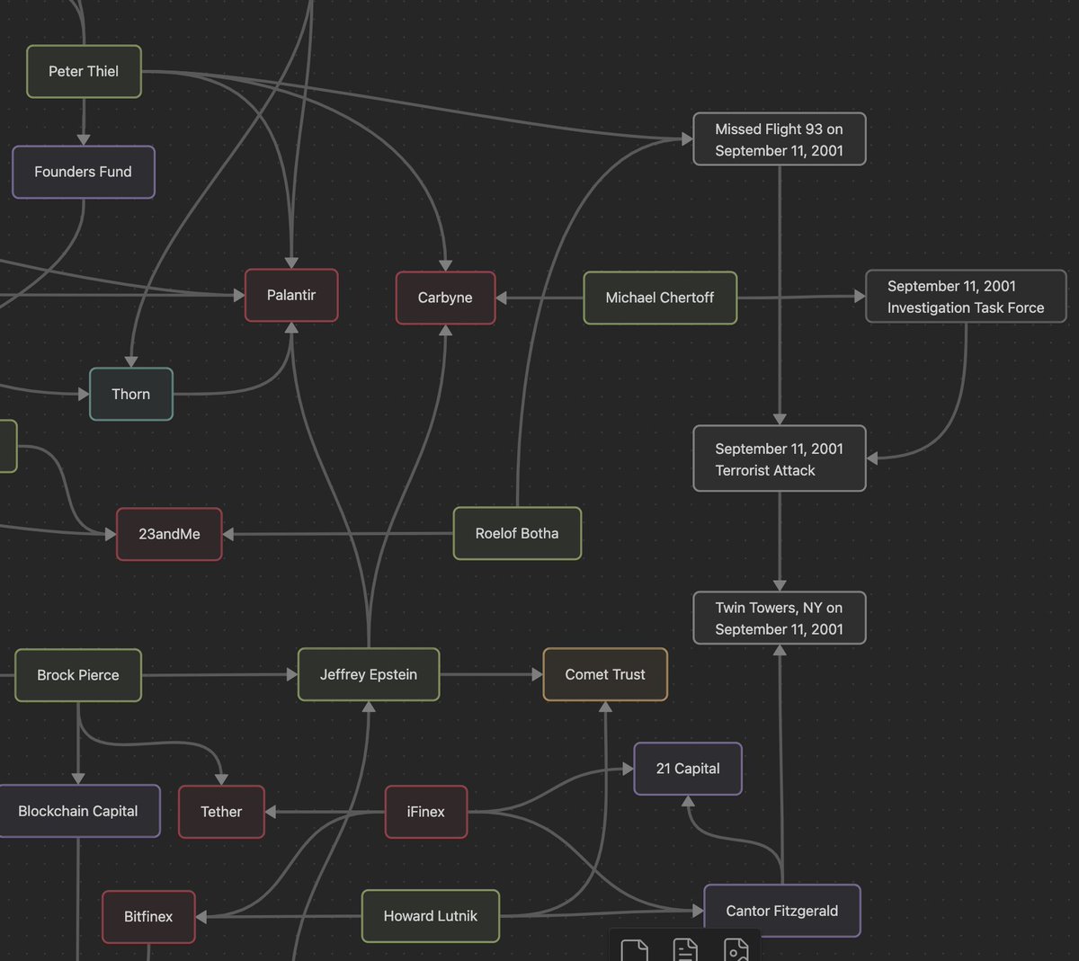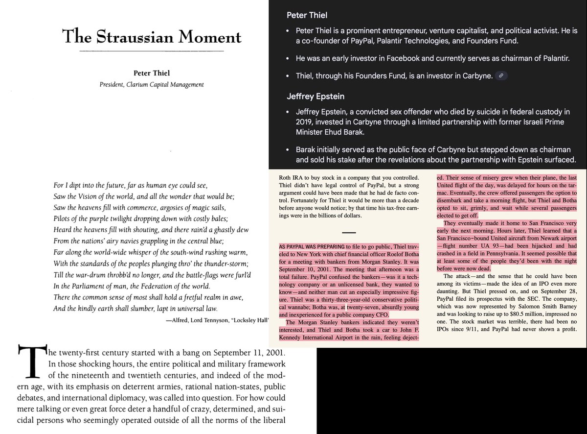 9.11 Epstein, Thiel, Lutnik, Pierce Tether, Palantir, Carbyne (Just a small batch of connections) Peter Thiel: > Peter Thiel and Roelof Botha allegedly narrowly avoided being on Flight UA-93 on the morning of September 11, 2001, which was hijacked and crashed in a field in PA. > Wrote “The Straussian Moment” in response to the September 11, 2001 attacks. The essay was published in 2007 as part of the collection Politics and Apocalypse. > 9.11 inspired his Palantir company, which was founded less than two years after the attacks and almost the same exact time the TIA (Total Information Awareness) was shut down for government overreach in the wake of 9.11 for spying on Americans without consent, created by John Poindexter of DARPA and US Naval Research. (Deeply ties to crypto and AI companies) Similar to Palantir, Thiel, Epstein and Trae Stephens of Palantir (amongst others) invested in a company called Carbyne (formerly 'Reporty Homeland Security') with many Israel intelligence (8200 Unit/ IDF) board members. Carbyne also has spying and tracking capabilities like Palantir. Both Palantir and Carbyne have ties to US/ Israel intelligence and government funding Michael Chertoff: > Advisor Board Member of Carbyne > Assistant Attorney General at DoJ during September 11, 2001 attacks and was deeply and immediately involved in the tracking and investigation of the terrorist attacks and to find our who was responsible and why > Helped establish Homeland Security post 9/11 and later became Secretary of DHS in 2005 > Carbyne, the Epstein/ Thiel funded company with ties to Israel was originally called "Reporty Homeland Security" (not a joke). Howard Lutnik > Trump's Secretary of Commerce > Avoided 9/11 attacks because running late taking his son to school > Cantor Fitzgerald, his company at the time located in the Twin Towers, destroyed in the attacks on 9/11, killing 658 employees; He avoided paying families of deceased employees which sparked controversy > Cantor Fitzgerald is the primary custodian for Tether’s U.S. Treasury holdings, managing a significant portion of its reserves and partnered with them to create 21 Capital for Bitcoin-based treasury > Epstein was trustee of NY building Lutnik purchased and was adjacent to Epstein's home, addresses also happen to be 9 and 11 (East 71st St) (9/11...) Brock Pierce > Mindshift - Jeffrey Epstein event 2011 + Crypto advisor > Co-founder Tether > iFinex (Tether/ Bitfinex) > Known P*do with Marc Collins-Rector