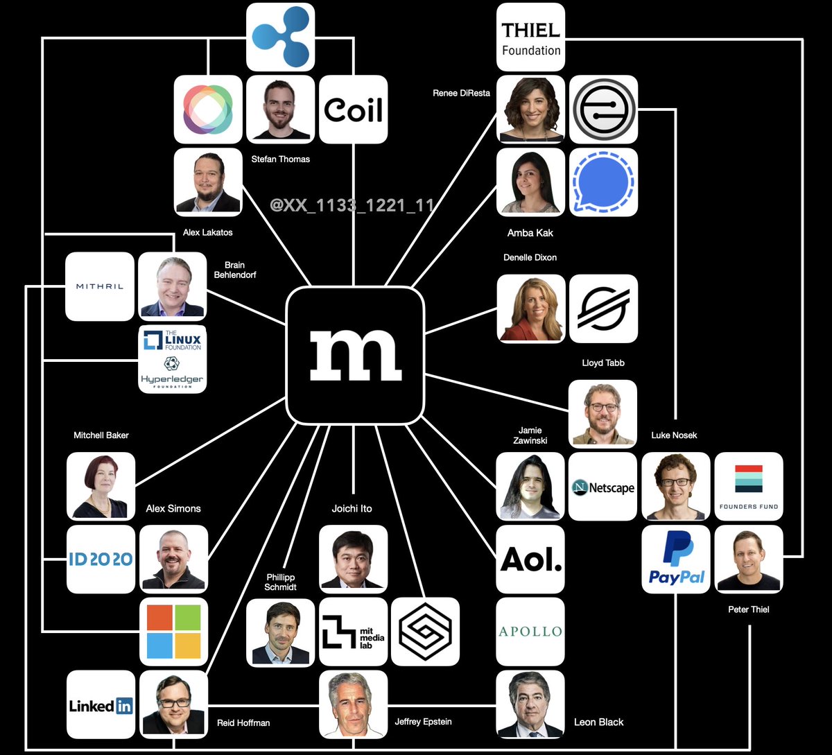 Mozilla… oddly connected to many interesting people and companies in crypto. Reid Hoffman (PayPal mafia/ Thiel/ Epstein +) Joichi Ito (MIT Media Lab former director before his scandal with Epstein was exposed… he and Epstein were close and ran Digital Garage together to fund other crypto and AI projects too) Phillip Schmidt (MIT Media Lab Director/ Accenture) Denelle Dixon (CEO of Stellar Development Foundation) Coil (Ripple company) Alex Lakatos (ILP CTO/ Ripple company) Jamie Zawinski (Nat Friedman close friend) Renee DiResta (CIA/ MobileCoin > Crypto project tied to many Assange / Musk / Snowden friends Brian Behlendorf (Hyperledger Executive Director / ID2020/ WEF/ former Obama advisor Sunlight Foundation donor (other donors include Palantir, Esther Dyson, World Bank, Microsoft, Open Society, Mark Cuban, MacArthur Foundation, Google,