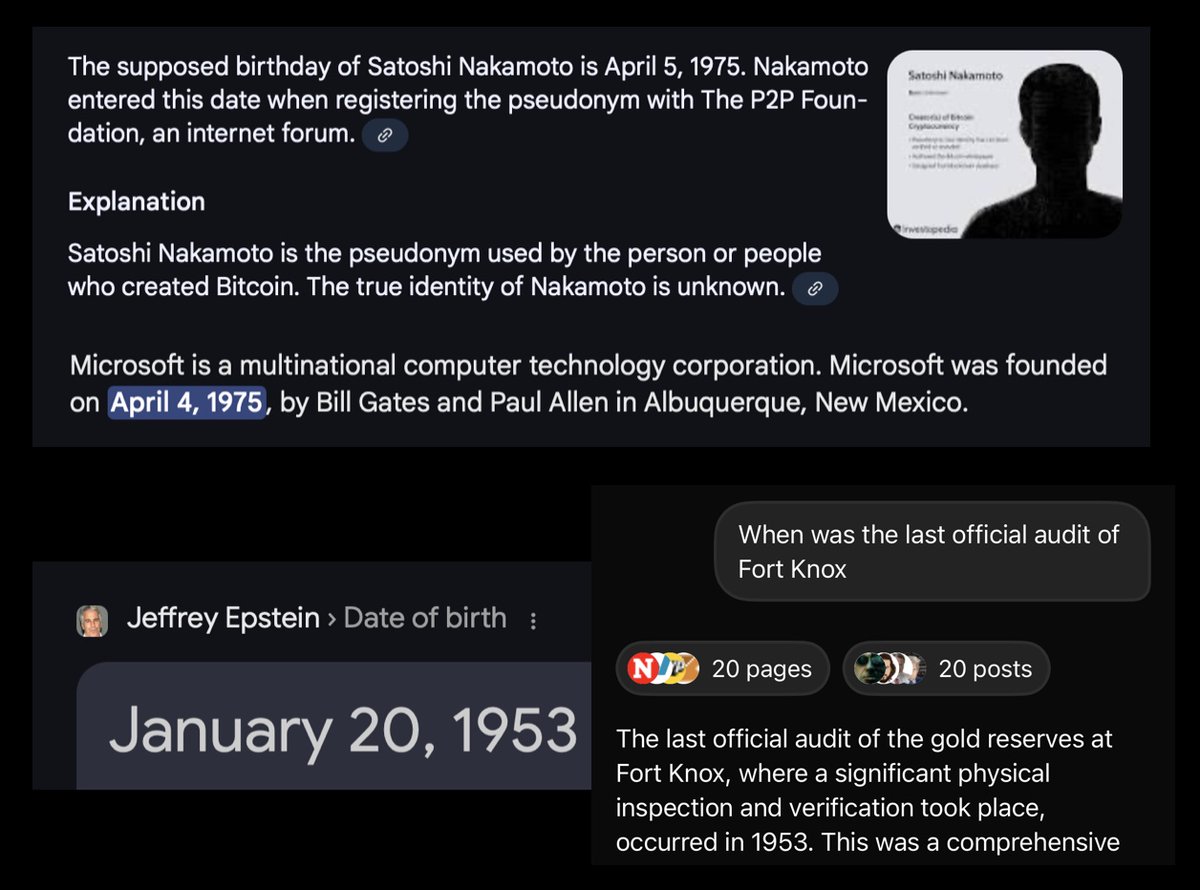 Microsoft founded 4.4.1975 Satoshi Nakamoto "born" 4.5.1975 Epstein/ Microsoft/ Gold "Digital Gold" - Bitcoin 1953 - Epstein born 1953 - Last official audit of Fort Knox Maxwell's last reddit post was about Bitcoin https://t.co/gjEcPabN9e