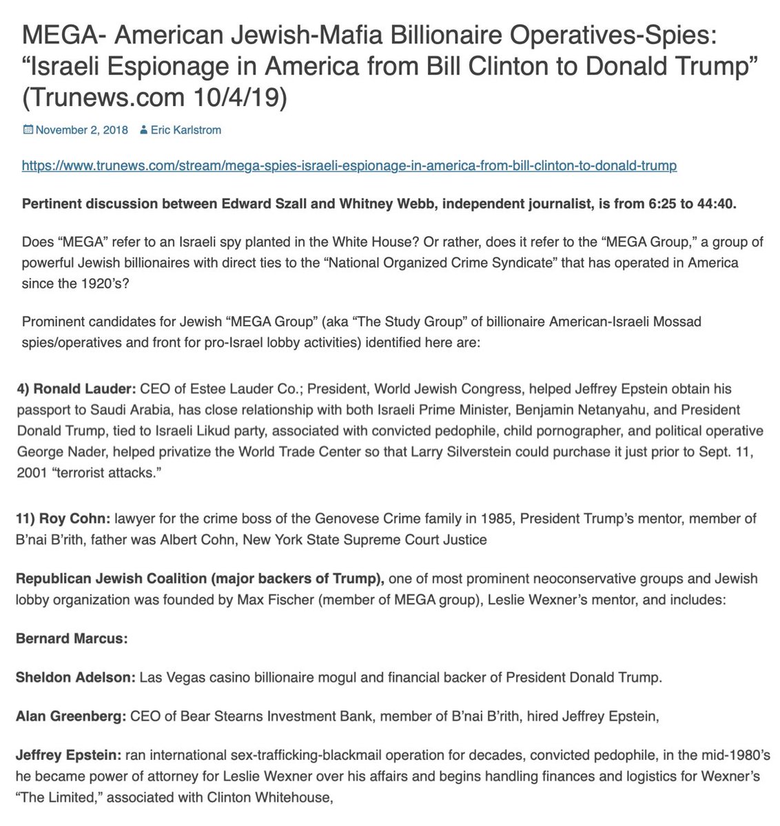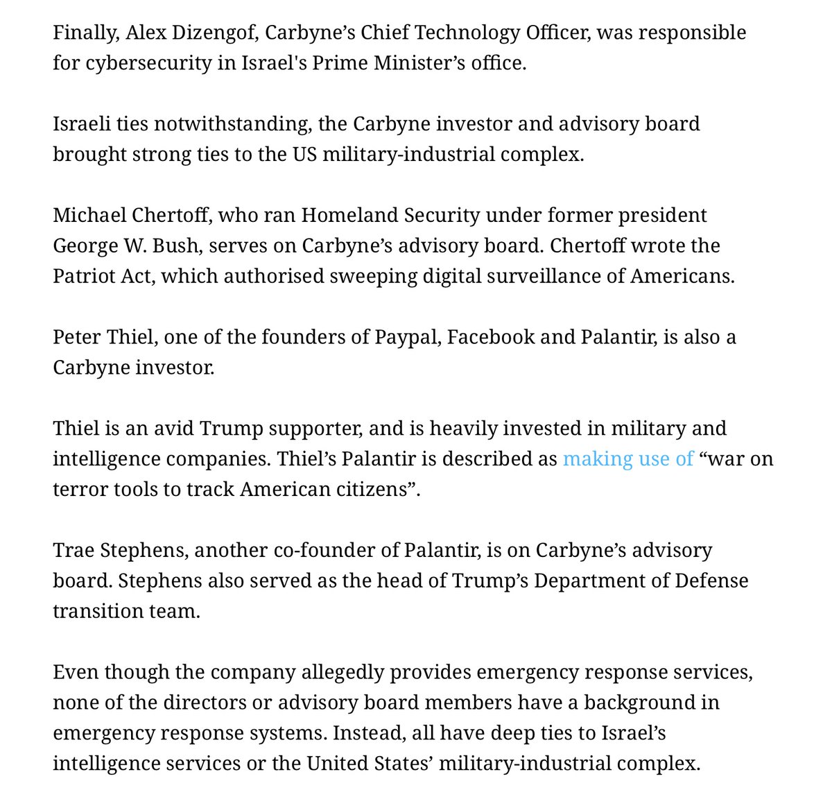 Jared and Joshua Kushner (Thread 1: Jared Kushner) Thread 1: Jared Kushner 10/ 14 The Carbyne connection Tom Barrack is a close friend of Donald Trump, Jared Kushner and Ivanka Trump, as well as Jeffrey Epstein and George Nader. Epstein arranged a sit down meeting between Tom Barrack and Peter Thiel, as well as a meeting between Tom Barrack and Ehud Barak, a close Epstein associate and 10th Prime Minister of Israel. Epstein and Ehud Barak had invested in Carbyne together, an AI emergency company used to spy on citizens. Trae Stephens of Founders Fund (Thiel) and Palantir (Thiel) sits on the board of Carbyne. Thiel is also an investor. George Nader, Jeffrey Epstein, Donald Trump and “MEGA Group” (Israel Mossad super group) includes members such as: Les Wexner (Epstein), Roy Cohn (Trump’s attorney and mentor), Ronald Lauder (Ties to all people listed above, got Epstein his Saudi Arabia passport, and got Silverstein to buy and insure Twin Towers just prior to 9.11.01), Jeffrey Epstein.. +