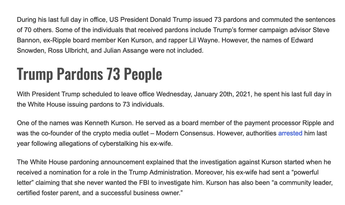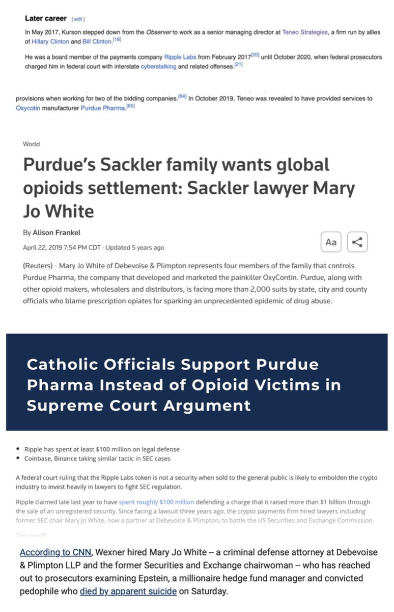 Jared and Joshua Kushner (Thread 1: Jared Kushner) Thread 1: Jared Kushner 11/ 14 Ken Kurson, Jared Kushner’s longtime best friend. Ken Kurson worked for Jared’s The New York Observer as an editor. He also advised and wrote speeches on the Trump campaign and White House. Kushner stepped down from his Observer to work with Trump in the White House as his closest advisor. He was replaced by his brother-in-law, Joseph Meyer (His sister is married to Jared’s brother, Joshua). Joseph Meyer worked with Paul Singer at Elliott Management and his banking firm is closely tied to AXA, a large firm with ties to Ripple and the Vatican. Paul Singer’s firm battled in a lawsuit about Argentina assets against Elon Musk’s SpaceX. On Trump’s last day in office, he issued many pardons, including Ken Kurson, who was convicted of cyberstalking and harassment of his wife. He also had several run-ins with sexual assault and harassment over the years with other women. In 2017, Ken stepped down from his role at Kushner’s Observer (New York Observer) to work at the Hillary Clinton and Bill Clinton firm, Teneo. Months later, Ken became a Ripple board member, and co-founded a crypto media outlet named Modern Consensus. Teneo provided services to Purdue Pharma (Sackler family), the same Sackler family Mary Jo White defended for their oxycontin scandal with Purdue. Mary Jo also defended Ripple in the case with the SEC, as well as Les Wexner, Epstein’s closely ally and business partner with ties to the CIA and Mossad.