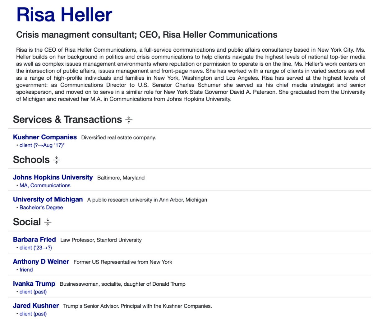 Jared and Joshua Kushner (Thread 1: Jared Kushner) Thread 1: Jared Kushner 12/ 14 Jared is the founder and principal of Kushner Companies, a real estate company. His sister Nicole Kushner Meyer also is a principal of the company. Risa Heller, crisis managment consultant; CEO, Risa Heller Communications, worked with Jared through his Kushner Companies. Risa Heller is close friends with: Jared Kushner, Ivanka Trump, and Anthony Weiner. Risa Heller was PR consultant for Sam Bankman-Fried’s mother, Barbara Fried. Kushner Company is funded by Berkadia. Berkadia has ties to In-Q-Tel (CIA investment arm) and Kirkland & Ellis, a law firm with ties to: Bill Barr (Father hired Jeffrey Epstein as Harvard professor, Worked under Trump in White House as Attorney General) Ken Starr (Client of Jeffrey Epstein and worked with Erik Prince and George Nader Blackwater/ ACADEMI) Alex Acosta (Approved a weak plea deal for Epstein, did not pursue charges after being told to “back off” by higher ups in the US government as Epstein was labels an “asset”) Pat Cipollone (Opus Dei member and counsel under President Trump) Bullish (Crypto company funded by Peter Thiel)