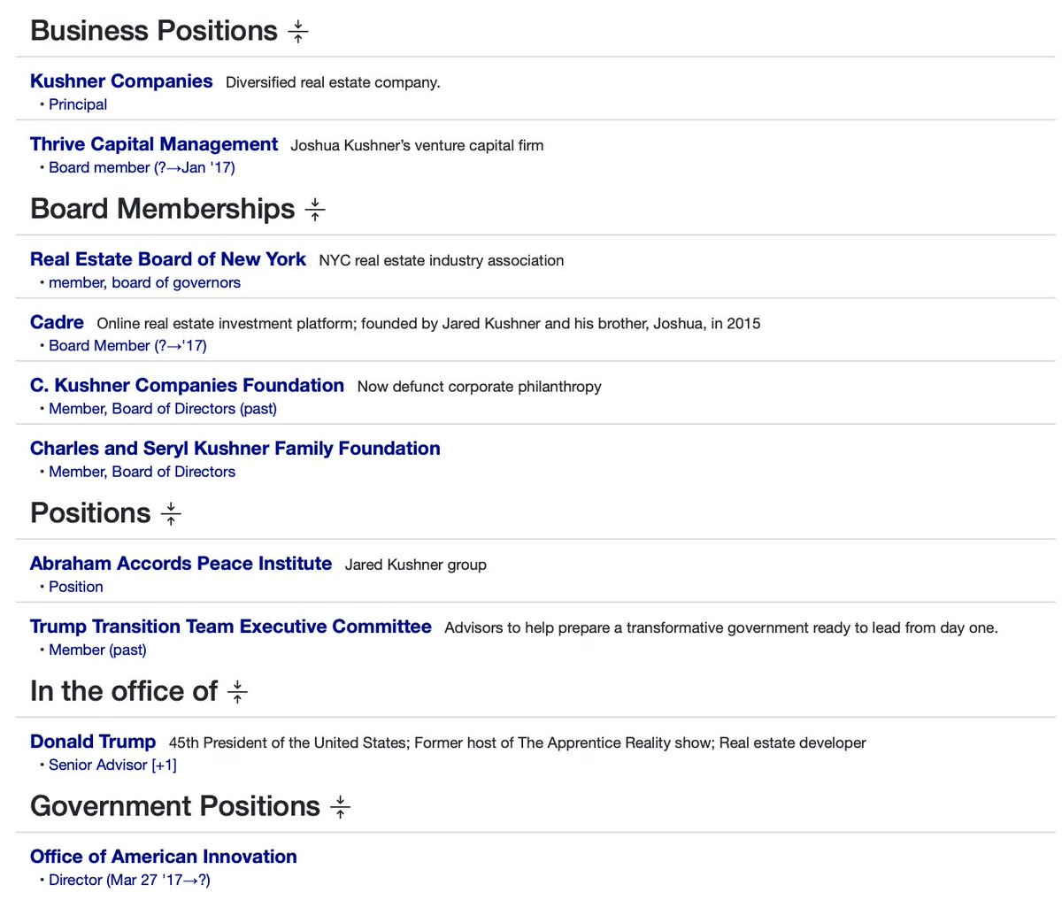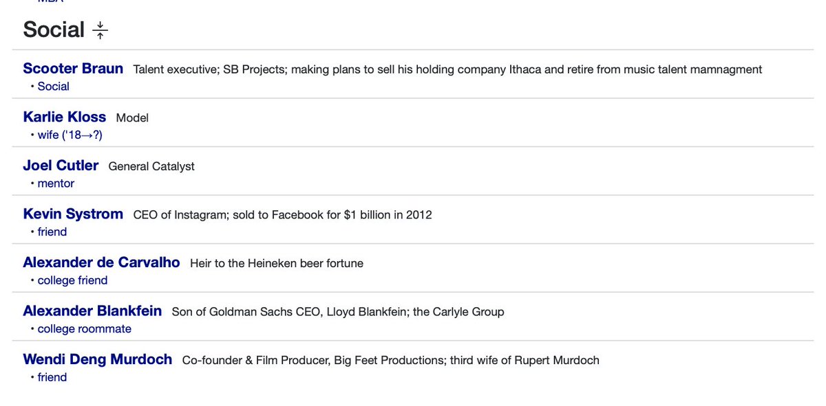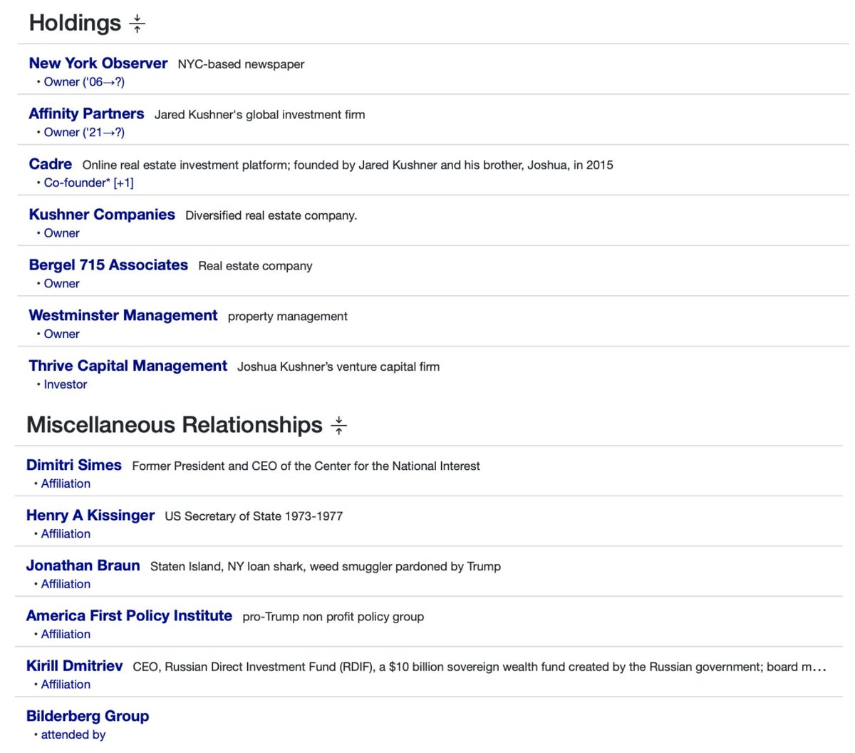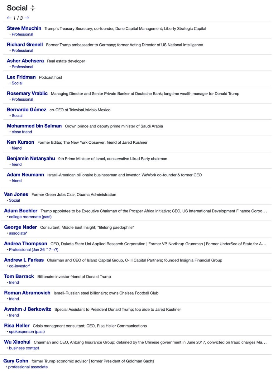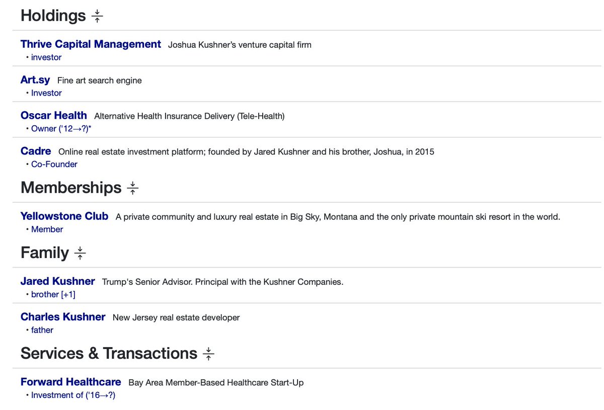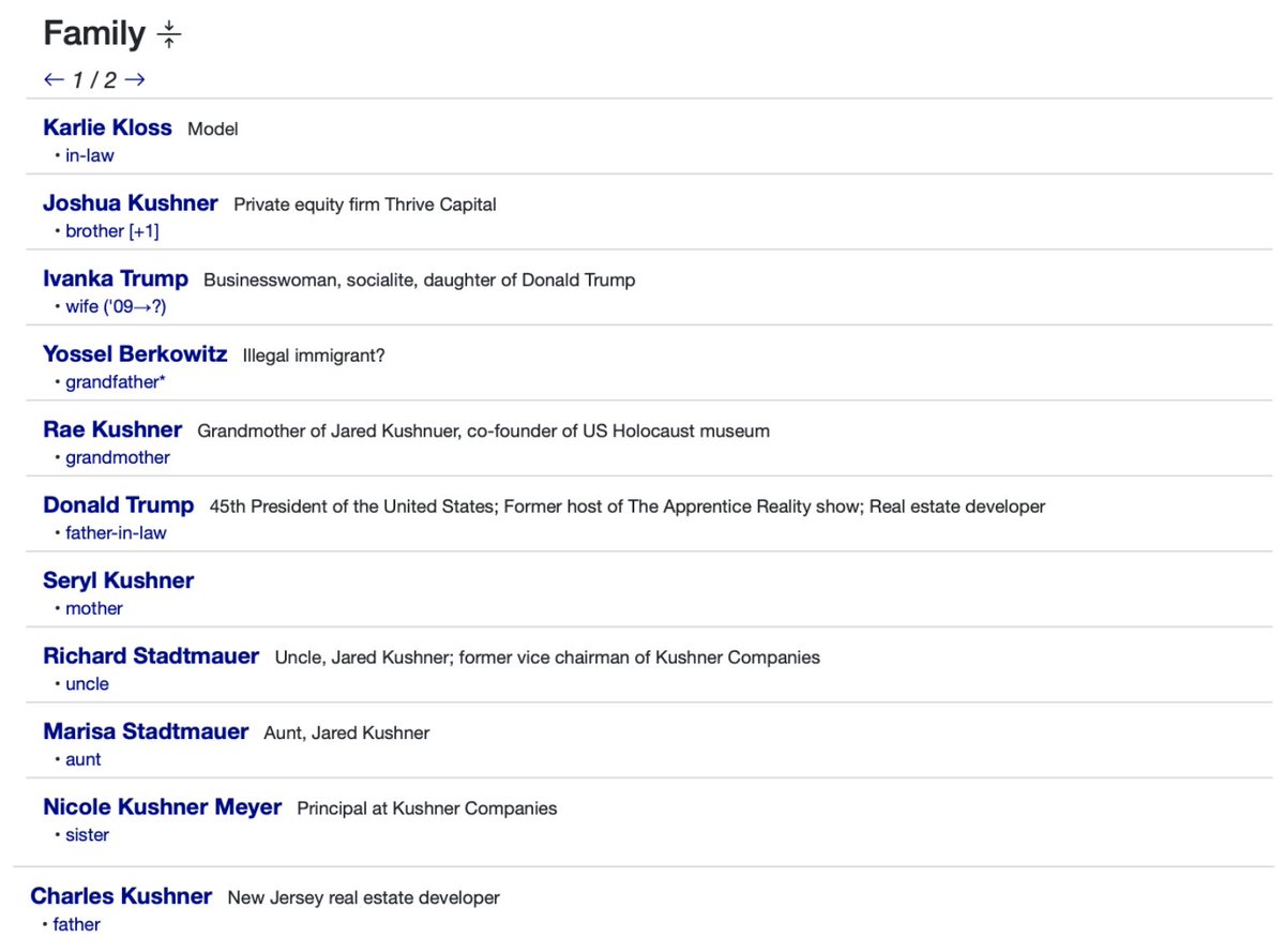 Jared and Joshua Kushner (Thread 1: Jared Kushner) Thread 1: Jared Kushner 2/ 14 Jared Kushner: Jared Kushner has an extensive reach in the elite circles around the world, including companies, politicians, oligarchs and world leaders. Business positions include: Kushner Companies Thrive Capital Management (Co-founded with brother Joshua Kushner) Affinity Partners Cadre Board Positions: 42Floors Positions under President Trump (Father-in-law): Senior Advisor to the President Trump Transition Team Executive Committee Office of American Innovation Abraham Accords Peace Deal (Leader) Holdings: New York Observer (Observer) Affinity Partners Cadre Kushner Companies Thrive Capital Bergel 715 Associates Westminster Management Family Members (Notable, to be mentioned later in thread): Joshua Kushner (Brother) Ivanka Trump (Wife) Donald Trump (Father-in-law) Charles Kushner (Father) Karlie Kloss (In-law) Nicole Kushner Meyer (Sister) Social and Misc. relationships: Steve Mnuchin Rosemary Vrablic Mohammad Bin Salman (Saudi Prince) Ken Kurson Benjamin Netanyahu Adam Neumann George Nader Andrew Farkas Tom Barrack Jeffrey Epstein Risa Hella Gary Cohn +