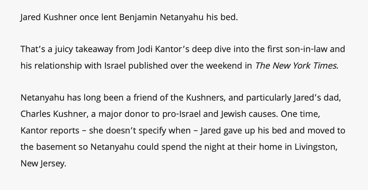 Jared and Joshua Kushner (Thread 1: Jared Kushner) Thread 1: Jared Kushner 3/ 14 Joshua Kushner (Brother) Holdings: Thrive Capital Management (Co-founded with brother Jared Kushner) http://Art.sy Oscar Health Cadre Memberships: Yellowstone Club Board Memberships: 42Floors Cadre http://Art.sy Family Members (Notable, to be mentioned later in thread): Joshua Kushner (Brother) Charles Kushner (Father) Karlie Kloss (Wife) Nicole Kushner Meyer (Sister) Social relationships: Scooter Braun Joel Cutler Kevin Systrom Wendi Murdoch + Jared Kushner’s family (and now the Trump family) has been a close friend of Israel Prime Minster, Benjamin Netanyahu. Jared father, Charles Kushner, is a longtime friend who let Netanyahu stay at his New Jersey home on several occasions, one time Jared even offered him his own bed.