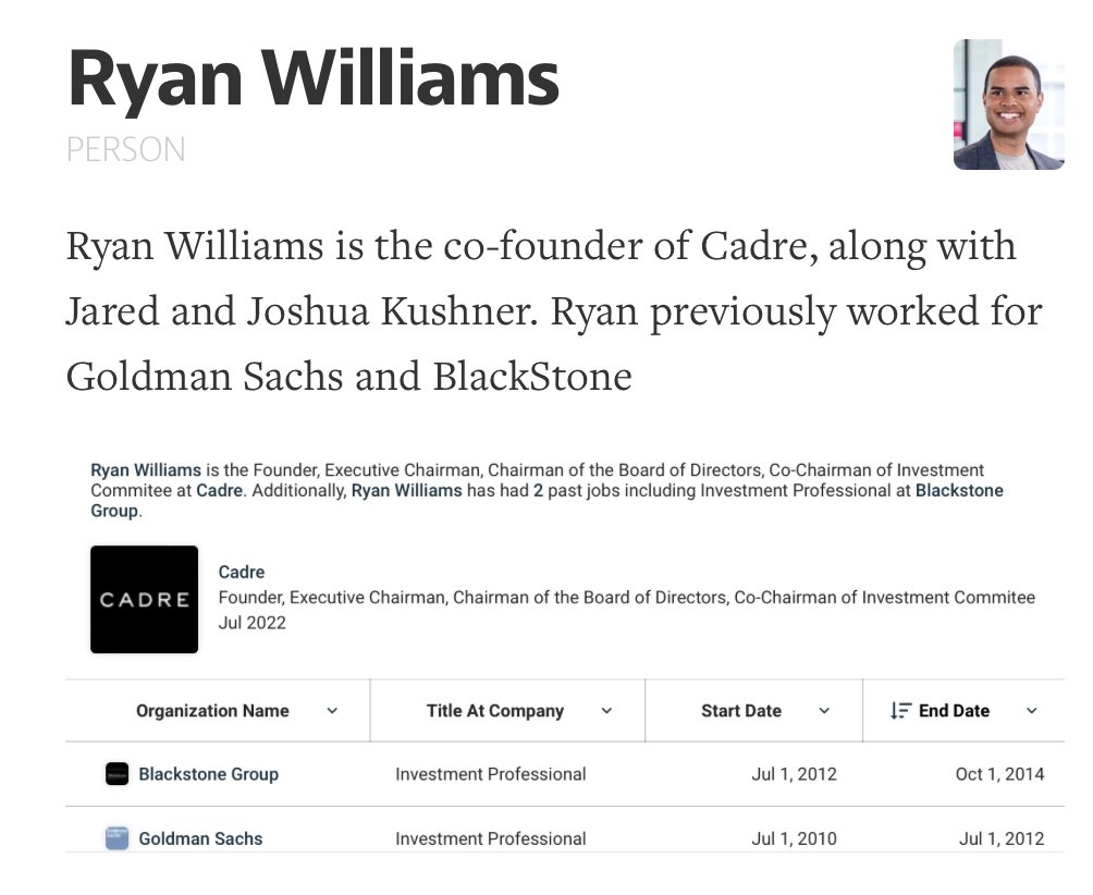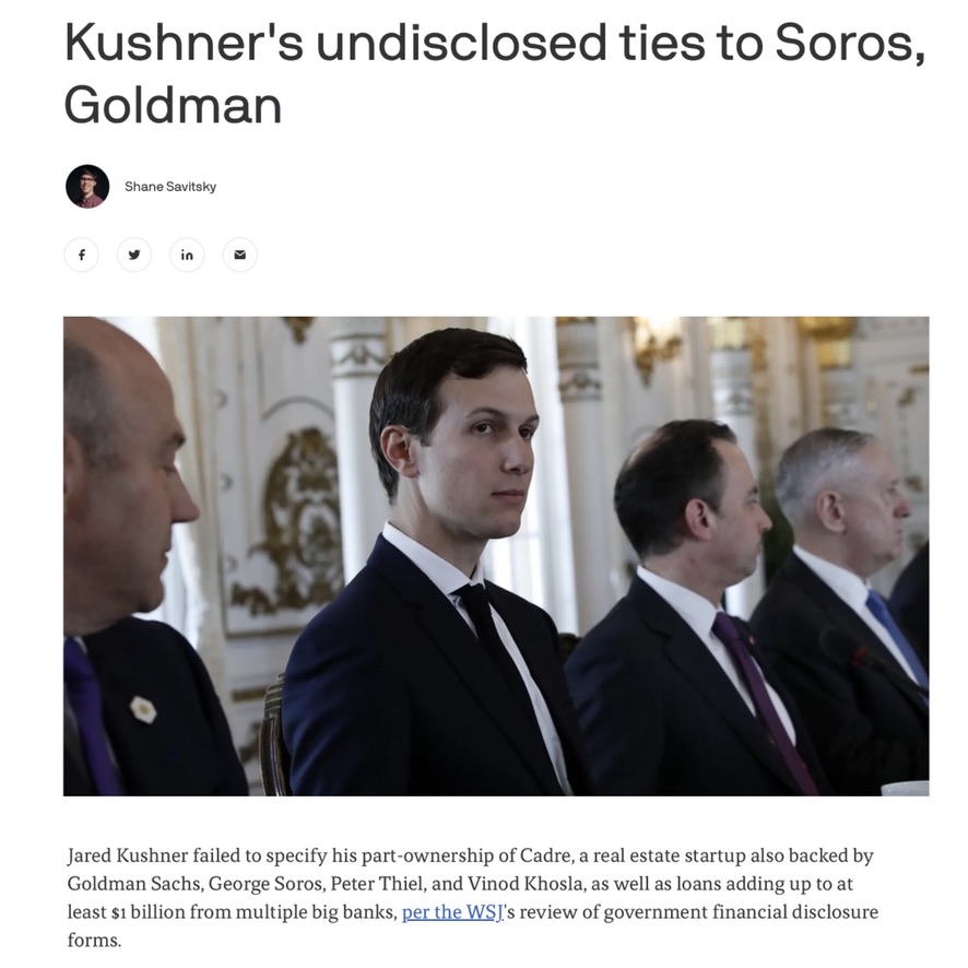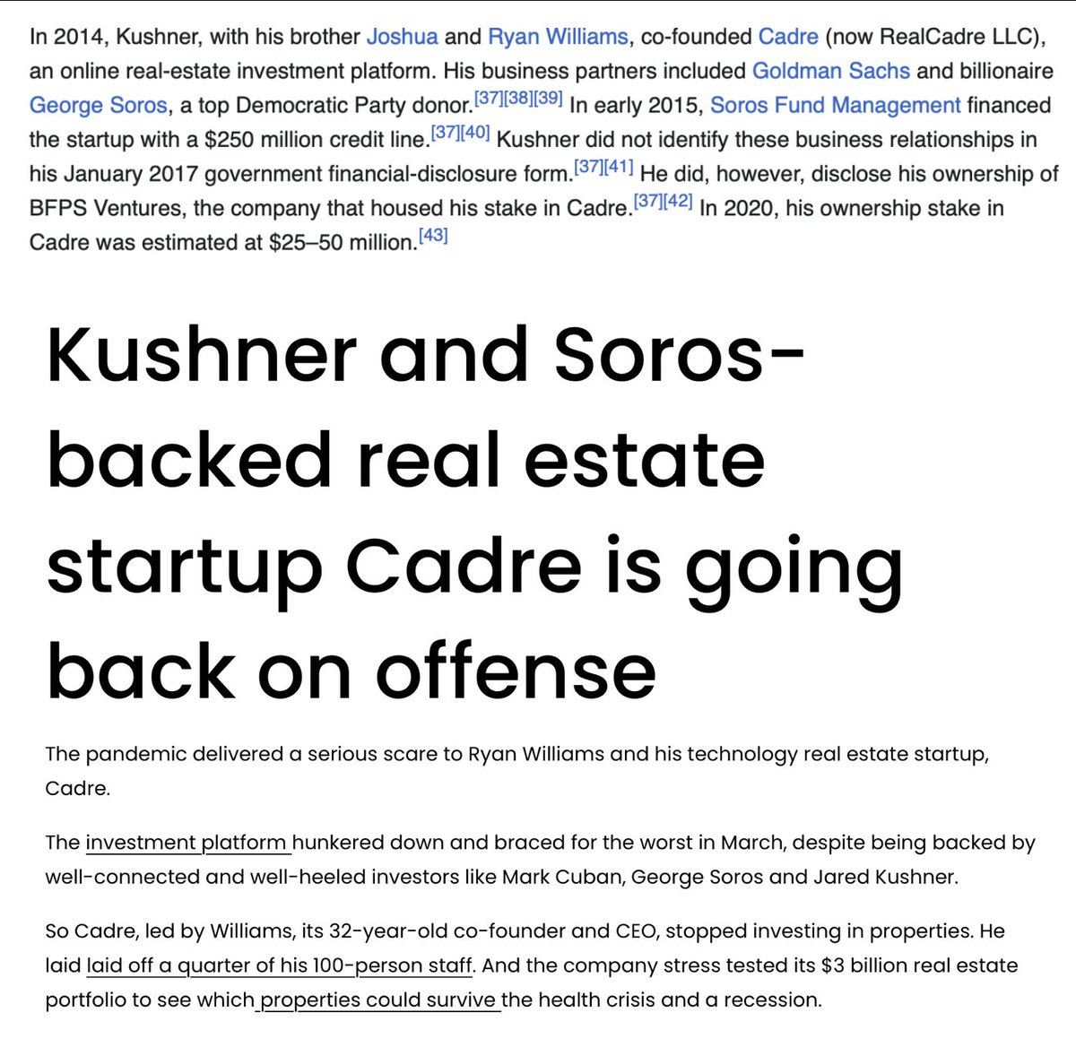 Jared and Joshua Kushner (Thread 1: Jared Kushner) Thread 1: Jared Kushner 6/ 14 Cadre Part I: Cadre is a technology-driven real estate investment platform that allows individuals and institutions to invest in commercial real estate properties. It was co-founded by Ryan Williams, Joshua Kushner, and Jared Kushner. Cadre is also backed by George Soros (likely through Soros Fund Management). George Soro’s and his Soros Fund Management have deep ties to Goldman Sachs and funded Ripple’s subsidiary Polysign (Now foreclosed) Cadre’s third founder, Ryan Williams, also worked for Goldman Sachs, a top funder of Cadre next to George Soros. Michael D Fascitelli of Goldman Sachs, a lead funder of Cadre, is also a Board Member of Toys “R” Us and former director of Vornado Realty Trust. Vornado Realty has ownership in several Trump and Kushner properties, and even was a bidder with Donald Trump of the 9.11 Twin Tower location for One World Tower (Freedom Tower) in 2004. Toys “R” Us has ties to Mitt Romney’s Bain Capital. Jared Kushner was a donor and endorser of Mitt Romney during his 2012 Presidential run. Cadre is funded by: Thrive Capital (Kushner’s VC) Khosla Ventures (Vinod Khosla, Epstein associate and transhumanist) Wendi Murdoch (Kushner friend) (Funds ByteDance [TikTok] Andreessen Horowitz General Catalyst (Stripe, Anduril, Oscar Health +) Goldman Sachs Founders Fund (Peter Thiel VC) Yuri Milner (Also funds Flexport, a Thiel circle ties company, Sam Bankman-Fried’s “DoNotPay”, and ByteDance (TikTok) Yuri Milner also co-founded DST Global (Cadre investor), which also funds Stripe, Robinhood, Flexport, similarly to Thrive Capital and Thiel ties companies Bryer Capital (Jim Bryer, also funds Circle and sits on their Board, as well as funding Chris Larsen’s Prosper Marketplace and sitting on the Board with him right before Larsen left for Ripple) Jaws Ventures (Also funds http://Art.sy [Kushner/ Wendi Murdoch company], and Relationship Science)