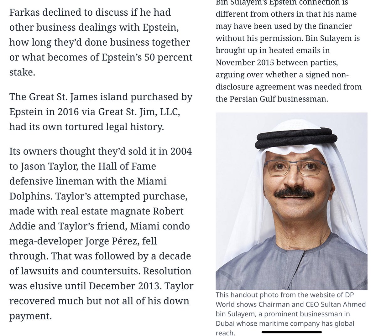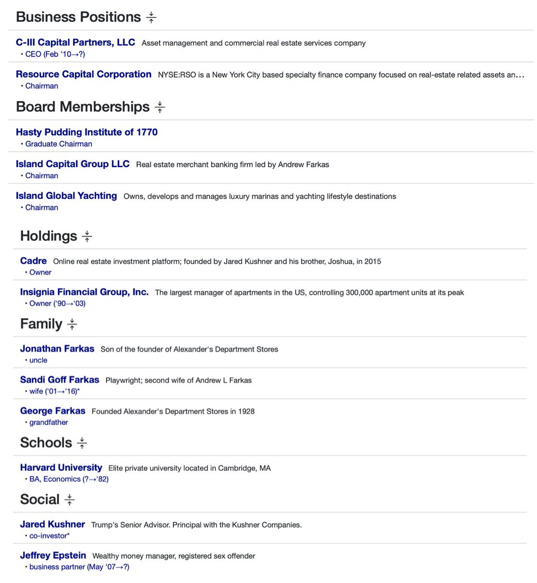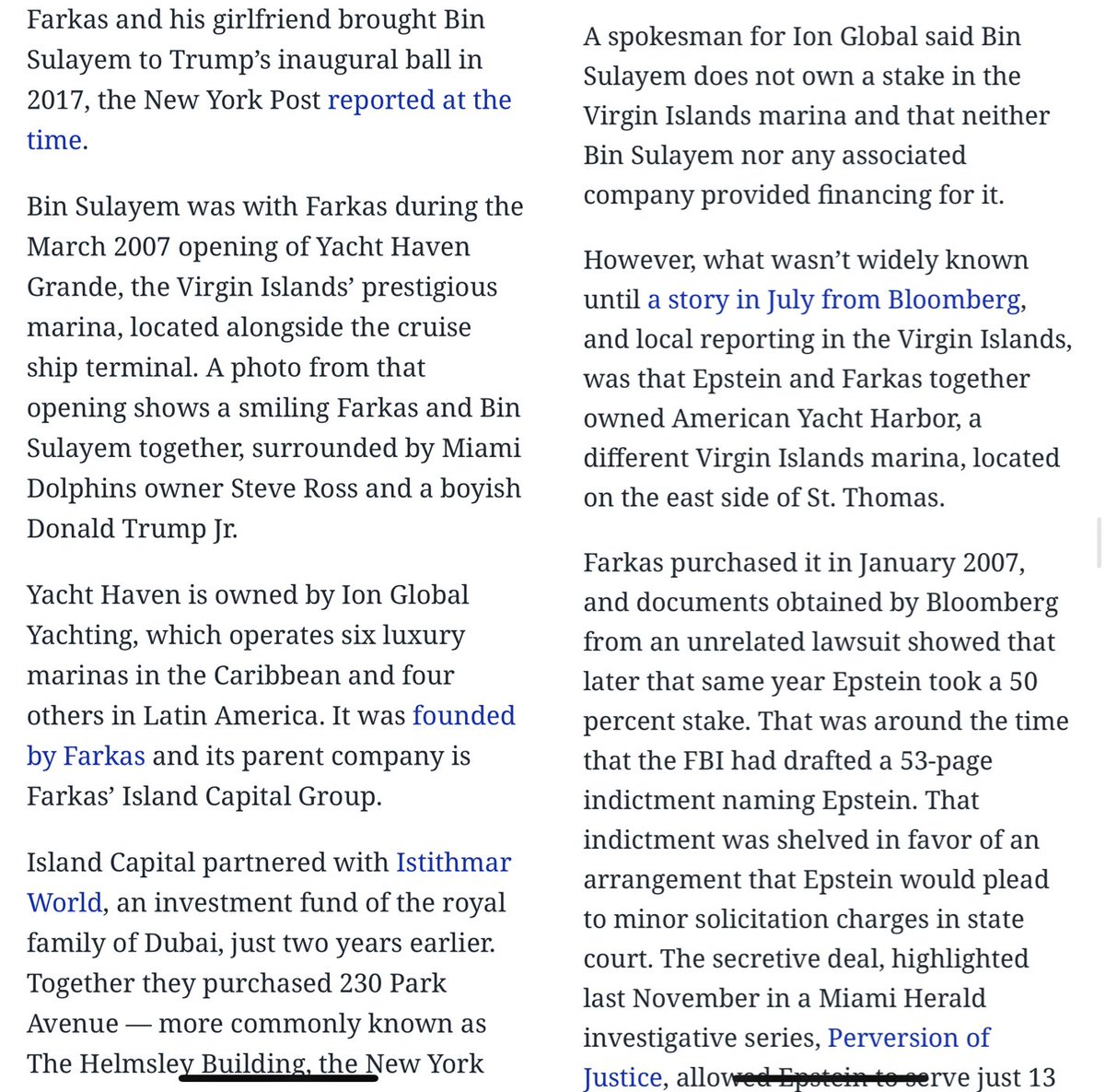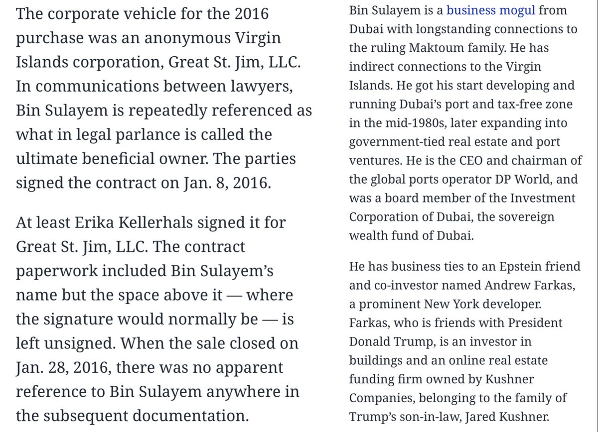 Jared and Joshua Kushner (Thread 1: Jared Kushner) Thread 1: Jared Kushner 7/ 14 Cadre Part II: Cadre has series A funding from Andrew L. Farkas. Andrew Farkas is : CEO of C-III Capital Partners, LLC Chairman of Resource Capital Corporation Chairman of Island Capital Group, LLC Chairman of Island Global Yachting Business Partner and close friend of Jeffrey Epstein from 2007 until his death in 2019 Co-investor and friend of Jared Kushner and Donald Trump. Andrew’s Father, Jonathan Farkas was good friends with Ghislaine Maxwell and Jeffrey Epstein. Andrew has business and personal ties to Saudi Arabia, specifically Bin Sulayem. Andrew has several ties to Saudi Arabia’s wealthiest families. Bin Sulayem was named as owner in the paperwork of Farkas’ Great St. Jim, LLC which is the LLC Epstein used to purchase his Little and Great St. James Islands. Farkas and Epstein own 50% each shares of American Yacht Harbor located in the Virgin islands on the east side of St. Thomas. Farkas used his Island Capital Group LLC, through IGY Marinas to purchase his 50% stake. Farkas also owned Yacht Haven in the Virgin Islands, and Bin Sulayem accompanied him at the grand opening, and Donald Trump Jr. was also in a photo with them at the opening. (Presumably with Donald Trump as well). Farkas even brought Bin Sulayem to Donald Trump’s Inaugural Ball in 2017 after he was elected President. Jared Kushner, along with his wife Ivanka Trump and Melania Trump are in Epstein’s Black book and are placed on his St. James Island at least once.