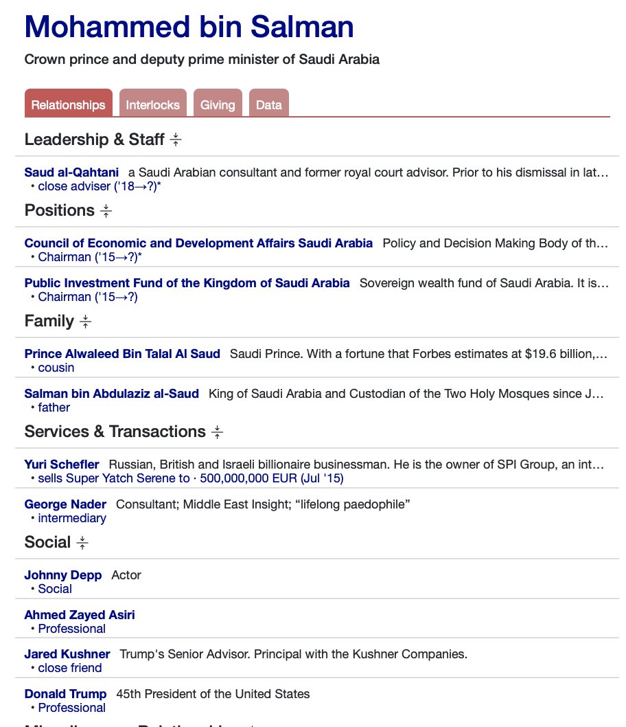 Jared and Joshua Kushner (Thread 1: Jared Kushner) Thread 1: Jared Kushner 8/ 14 Jared and Saudi Arabia connections Continuing from the Saudi Connections in previous post, with Trump family friend, Epstein business partner friend, and investor of Kushner’s Cadre, Andrew Farkas, who is close with several wealthy Saudi families including Bin Sulayem. Jared has been a good friend of Saudi Prince, Mohammad bin Salman. Jared Kushner played a leading role inside the Trump administration defending Crown Prince Mohammed after U.S. intelligence agencies concluded that he had approved the 2018 killing and dismemberment of Jamal Khashoggi, a Saudi columnist for The Washington Post and resident of Virginia who had criticized the kingdom’s rulers. Donald Trump once purchased a yacht (Trump renamed the ‘Trump Princess’) from Jamal Khashoggi’s Uncle, Adnan Khashoggi, a known Saudi arms dealer. (Perhaps there is more to the assassination cover up during Trump’s White House with Saudi Arabia…) It was later found that Pegasus spyware was used by Saudi Arabia in the assassination. A spyware with close connections to Israel Mossad, Saudi Arabia, Michael Flynn, Erik Prince, Joel Zamel, George Nader, and Russian Oligarchs, Cambridge Analytica, Black Cube, Blackwater. Jared also led the Abrahamic Accords in the Middle East, establishing peace with Israel and several middle eastern states, including Saudi Arabia. Jared created a close relationship while in the White House with bin Salman, and even landed a $2,000,000,000 deal with Salman and the Saudi Arabia Public Investment Fund to fund his new investing firm, Affinity Partners. Mohammed bin Salman’s cousin, Prince Alwaleed bin Talal Ad Saud, has had relations with the Trump family since the early 90’s, with ownership in the Plaza Hotel once owned by Donald Trump. When Trump and Alwaleed owned the Plaza, Epstein and Maxwell had a memorial for Ghislaines father, Robert Maxwell, a once affiliate of Donald Trump and former Mossad and Russian agent. Prince Alwaleed has been a close friend and business partner of George Soros, who is the financial backer of Jared Kushner’s Cadre, which also has funding from previously mentioned Epstein friend and business partner Andrew Farkas, who has deep ties to elite Saudi Arabian family and princes. Side Note: Prince Alwaleed’s Kingdom Holding Company, along with the Saudi Arabia Public Investment Fund Jared Kushner used to fund his Affinity Partners investment firm, has a large stake in Elon Musk’s “X” platform. Elon Musk and Jared Kushner were photographed with Saudi Princes at the World Cup in Qatar.