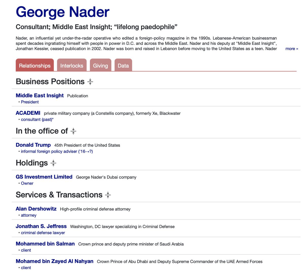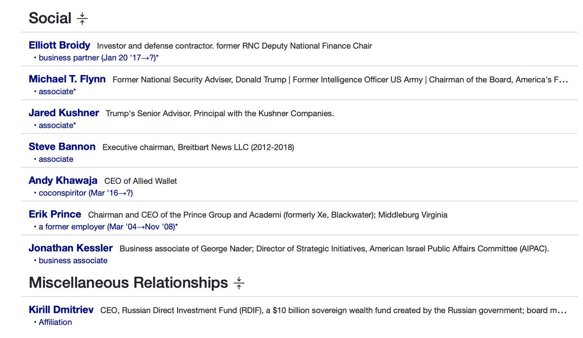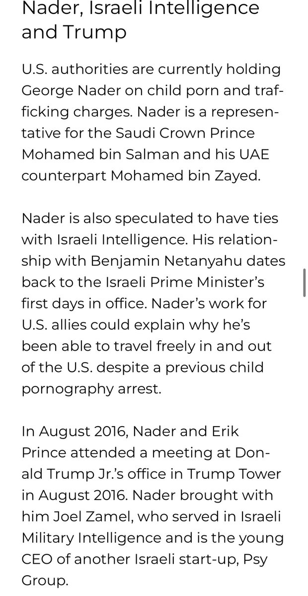 Jared and Joshua Kushner (Thread 1: Jared Kushner) Thread 1: Jared Kushner 9/ 14 The “Nader” Connection Jared met with bin Salman’s closest intermediary, George Nader, on several occasions. George Nader is a multi-convicted “lifelong pedophile”. Nader was also an “informal foreign policy advisor” for Donald Trump from 2016. George Nader, Erik Prince (Co-workers under Blackwater) and Joel Zamel all met with Trump to create a social media manipulation campaign under Zamel’s Pys Group in 2016. Kushner and Don Jr. were also present at this meeting. (Likely in part where Q came from). Nader has direct ties with: Jared Kushner Alan Dershowitz (Epstein attorney and friend who also defended Trump during his impeachment trials) Erik Prince (Worked together at ACADEMI aka Blackwater, sister of Trump’s education Secretary, Betsy DeVos (Amway founder) Elliott Broidy (Ties to Jho Low, Tom Barrack, Guo Wengui, Rick Gates, Trump, Steve Mnuchin, Mohamed bin Zayed Al Nahyan) Michael Flynn (Worked with Erik Prince on Blackwater and other psyop campaigns) Pegasus spyware and Saudi Arabia murder of Jamal Khashoggi. Tom Barrack (Epstein friend and co-funder of Israel’s Carbyne spyware and Donald Trump friend since 80’s) Jared Kushner, George Nader and Erik Prince also have another friend in common aside from bin Salman, Kirill Dmitriev. Kirill Dmitriev is CEO, Russian Direct Investment Fund (RDIF), a $10 billion sovereign wealth fund created by the Russian government; board member, Mobile TeleSystems. Close relations with the Kremlin and Vladimir Putin. Kirill may have been involved with or partially funded the Pegasus Spyware as described earlier, which did have ties to several known and unknown Russian oligarchs working with Israel and Saudi Arabia.