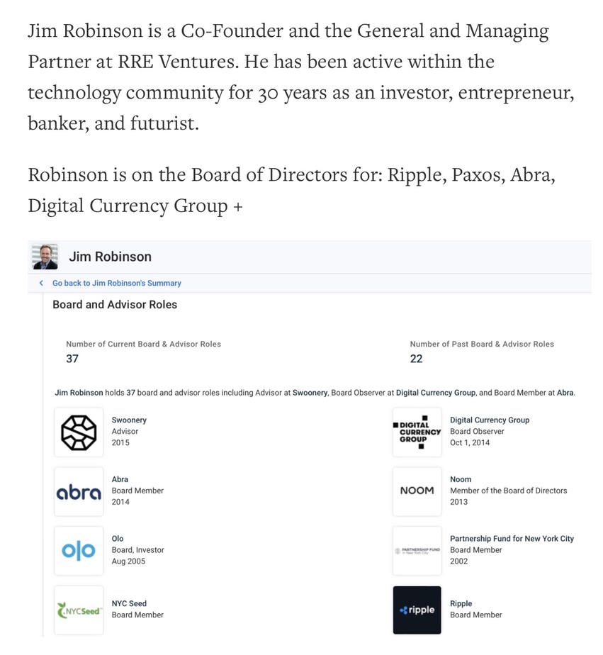Rothschild, Soros, & Rockefeller Thread 6/ 7 RRE Ventures GGV funds Animoca Brands and owned by Vocera Communications, which is owned by: Venrock (Rockefeller VC) RRE Ventures (Ripple funder) Jim Robinson works with/ for: RRE Ventures (Co-founder) Vocera Communications (Board Member( Paxos (Board Member) Ripple (Board Member) Digital Currency Group (Board Observer) Abra (Board Member) 8i (Board Member) All tied to Ripple, Stellar, Rockefellers, Rothschild one way or another James Robinson works with/ for or invested in: RRE Ventures (Co-Founder/ Partner) Chain (Investor) > Chain became Interstellar which was acquired by Velo as described above, tied to Rothschild funded Aspen Digital Interstellar (Board Member) Chain was also funded by: Thrive Ventures > Kushner VC RRE Ventures Visa Nasdaq Blockchain Capital (Brock Pierce) Pantera (McCaleb/ Steve Waterhouse) Keith Rabois of PayPal mafia/ Khosla Ventures Scott Banister of PayPal mafia Digital Currency Group/ Barry Silbert 8i is founded by Yu Pan, tied to the PayPal mafia, including Thiel, Musk, Levchin and others.