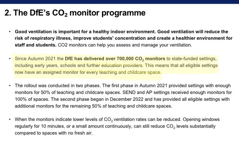 The DfE paid lip service to improving ventilation by providing CO2 monitors for every classroom across the UK. But sadly the scheme has ended up being a disaster. Some monitors didn’t work properly & hardly any are being used anymore since there is no governance to the scheme.
