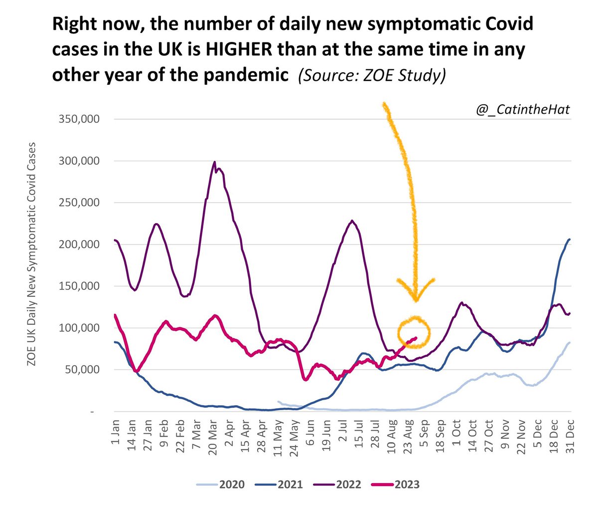 For starters, we are NOT post-pandemic. Right now, the number of daily new symptomatic Covid cases in the UK is HIGHER than at the same time in any other year of the pandemic. In fact, it’s currently even higher than it was during any of the 3 national lockdowns!