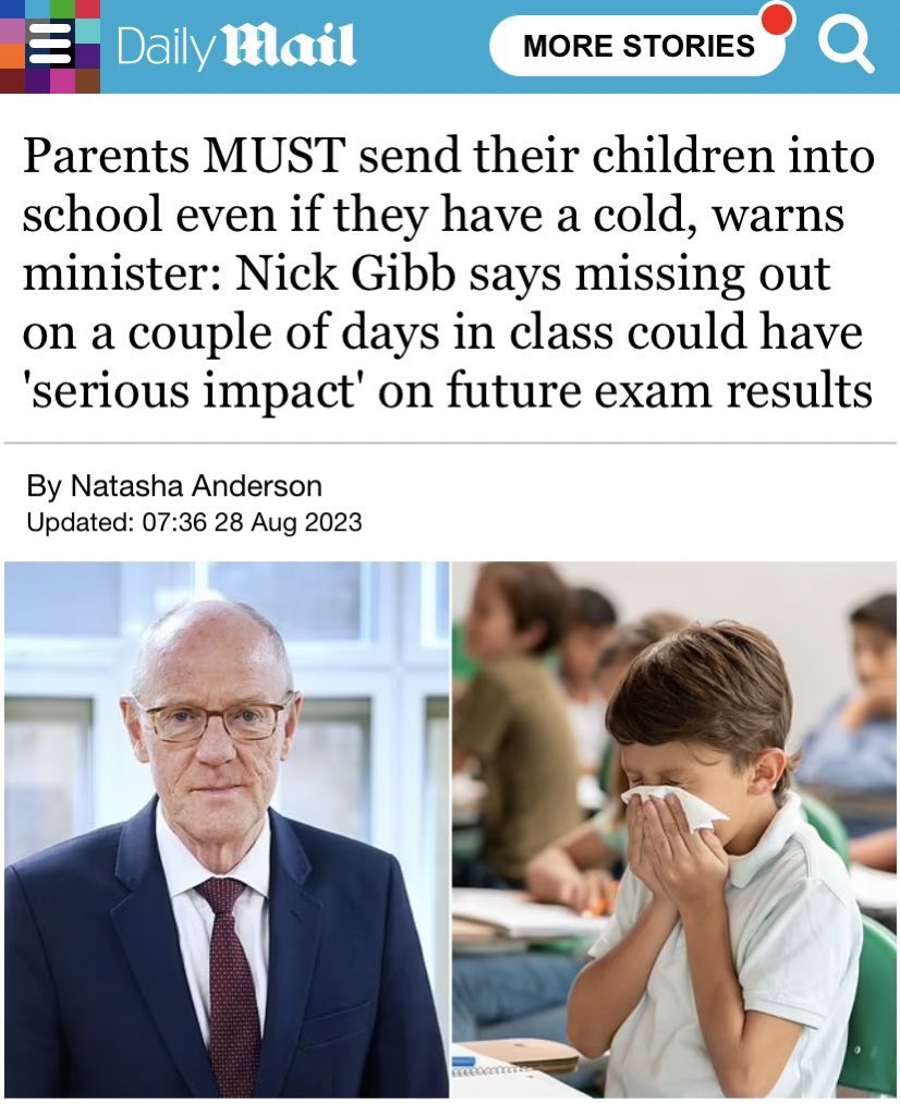 Instead, they’re actually doing the opposite! There’s going to be a massive push for 100% attendance this academic year. But forcing sick kids to come to school is NOT going to fix the issue. It’s only going to make it WORSE by increasing transmission. https://www.dailymail.co.uk/news/article-12451747/amp/Parents-send-children-school-cold-warns-minister-Nick-Gibb-says-missing-couple-days-class-impact-future-exam-results.html