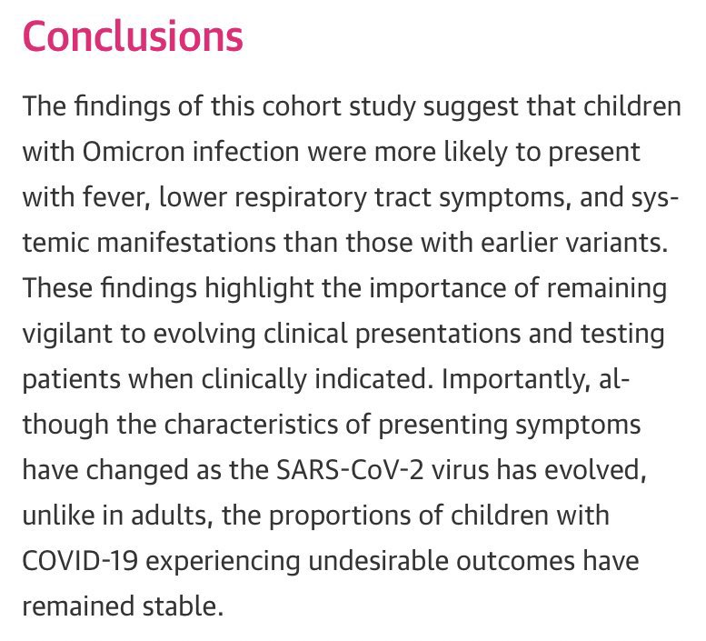 The media have done a great job of convincing everyone that Omicron is less of a worry as it has “evolved to become milder”. But this is a myth as far as kids are concerned. The % of kids experiencing undesirable outcomes is unchanged with Omicron. https://jamanetwork.com/journals/jamanetworkopen/fullarticle/2802161