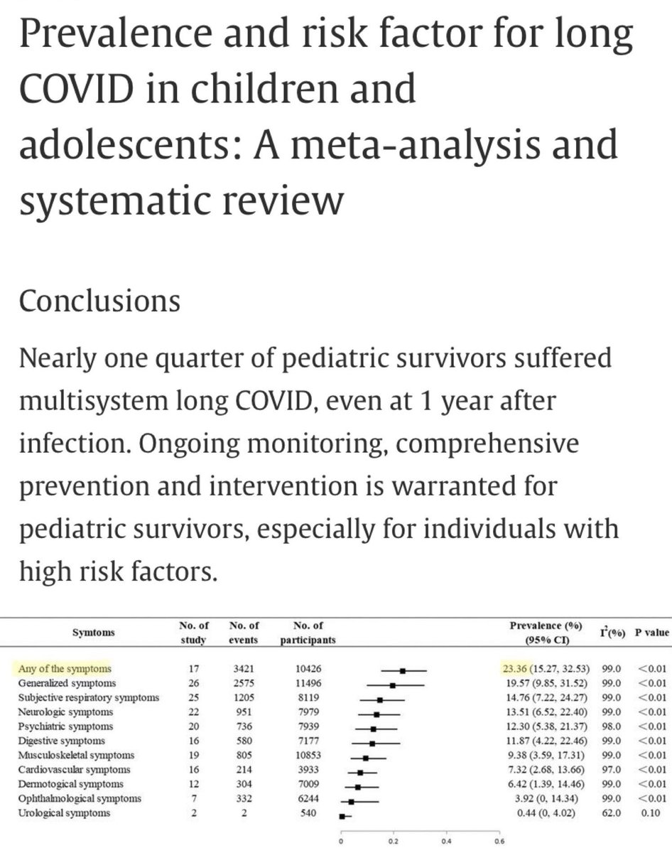 A recent meta-analysis reviewed multiple studies to determine the prevalence of Long Covid amongst children. Nearly one QUARTER of all children infected with Covid suffer from Long Covid, including respiratory, neurological & cardiovascular symptoms. https://www.sciencedirect.com/science/article/pii/S1876034123000710