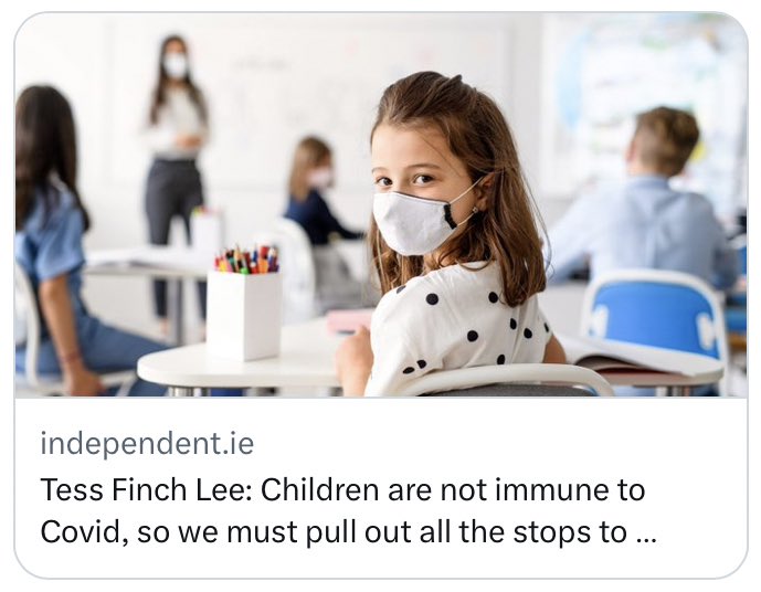 @DrNick4126 And this superb article from the Irish press is also well worth a read 👇🏻 “I never imagined that trying to protect children from repeated, forced, infections with a level-three biohazard known to cumulatively harm them would be deemed controversial.” https://www.msn.com/en-ie/health/other/tess-finch-lee-children-are-not-immune-to-covid-so-we-must-pull-out-all-the-stops-to-protect-them/ar-AA1g7BCo https://t.co/x984u10UiM