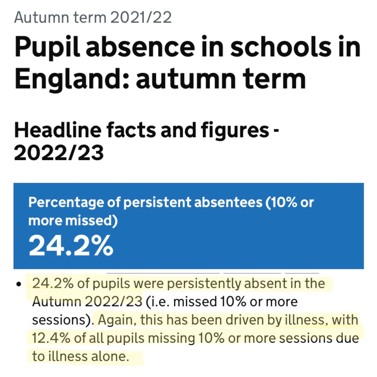 Another measure we can look at is Persistent Absence: the number of children who have missed 10% or more sessions. Government analysis shows that, last Autumn term: 📍Persistent Absence Rate: 24.2%. That’s A QUARTER of pupils! 📍Again, this was mainly driven by ILLNESS.