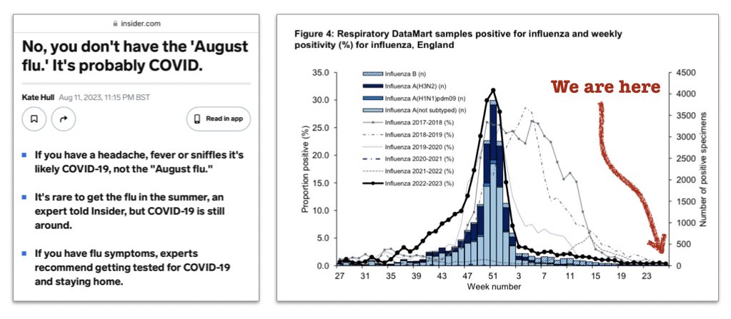 And yet… Everywhere I go, I hear people with that hacking cough… Everywhere I go, I hear people complaining about how they’re just recovering from the “Summer flu”… But there is *no* flu in summer. It’s highly seasonal. Unlike Covid. https://www.insider.com/august-flu-vs-covid-infection-rate-2023-8