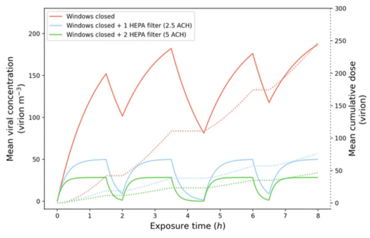 Similarly, this Swiss study examined the effectiveness of air filters at reducing Covid transmission in a typical classroom: 📍HEPA filters delivering a CADR of 800m3/h led to a 5-fold decrease in the cumulative viral dose absorbed by exposed occupants. https://smw.ch/index.php/smw/article/view/3201/5368