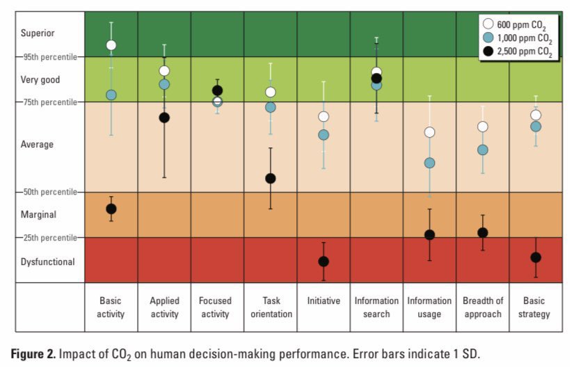 As well as reducing the spread of illness, good ventilation also reduces the build-up of CO2 levels in classrooms. High CO2 levels can affect children’s concentration. Look how cognition plummets when the CO2 increases to 2,500ppm (the black spots). https://www.researchgate.net/publication/231176310_Is_CO2_an_Indoor_Pollutant_Direct_Effects_of_Low-to-Moderate_CO2_Concentrations_on_Human_Decision-Making_Performance