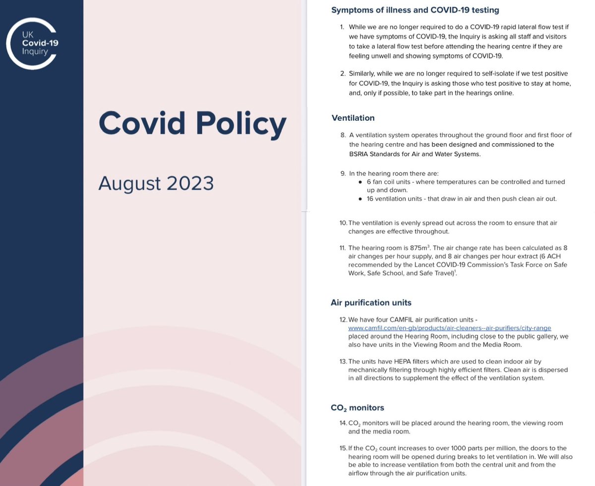 All the experts who have studied the evidence of the pandemic so far are currently convening at the Covid Inquiry. It’s interesting that they have set out EXTREMELY strict guidelines for testing, ventilation, air filtration & CO2 monitoring for those attending the Inquiry. 🤔 https://t.co/OMxGN6AQLY