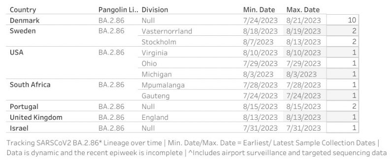 It’s still early days, but this BA.2.86 variant is now popping up all over the place. 23 samples have been detected so far in 7 different countries. That might seem like a small number, but this global spread indicates that cross-border transmission is happening.