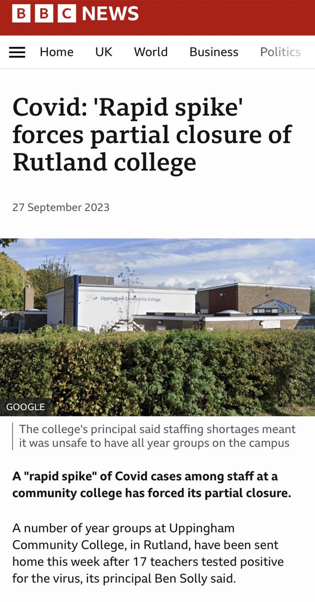 ILLNESS IN SCHOOLS, a thread And so it begins… 17 members of staff are off sick with Covid at Uppingham Community College and they’ve been forced to partially close their doors to pupils. https://bbc.co.uk/news/uk-england-leicestershire-66936189.amp