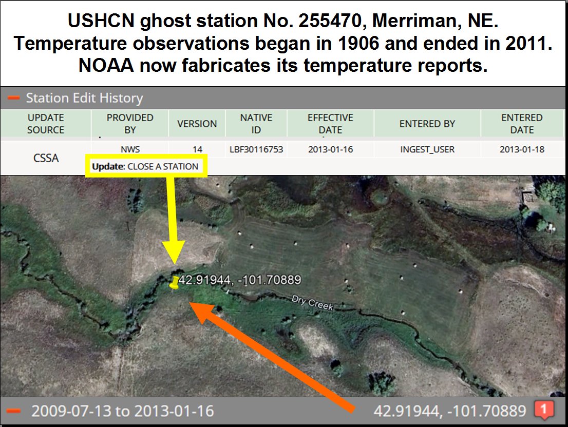 Merriman, NE has a ghost station: USHCN No. 255470. It was a perfect rural location, but it's now gone. Ever since 2011, NOAA has been fabricating its temperature data. #NOAAghoststation https://t.co/s8UMlm6t16