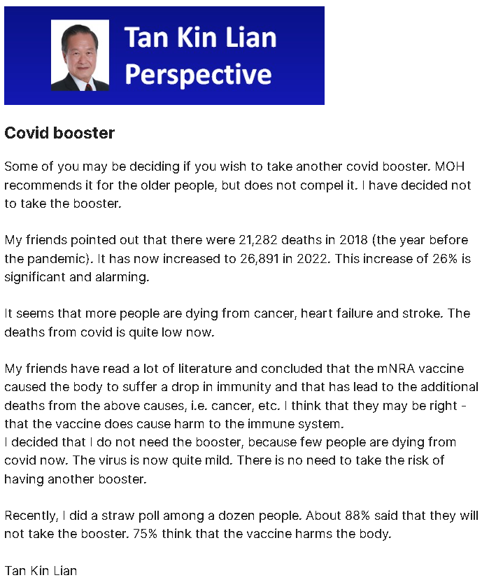 🚨🚨🚨🚨 Holy Moly! Another U-Turn! The ex-CEO of Singapore's largest local Insurance provider just issued a statement advising against COVID Boosters! Mr. Tan Kin Lian, most notably known for his extensive 30-year tenure as CEO of NTUC Income, Singapore's only insurance cooperative, issued a statement on 6th December 2023. Full Statement: ----------------------------------------------------- Covid booster Some of you may be deciding if you wish to take another covid booster. MOH recommends it for the older people, but does not compel it. I have decided not to take the booster. My friends pointed out that there were 21,282 deaths in 2018 (the year before the pandemic). It has now increased to 26,891 in 2022. This increase of 26% is significant and alarming. It seems that more people are dying from cancer, heart failure and stroke. The deaths from covid is quite low now. My friends have read a lot of literature and concluded that the mRNA vaccine caused the body to suffer a drop in immunity and that has lead to the additional deaths from the above causes, i.e. cancer, etc. I think that they may be right - that the vaccine does cause harm to the immune system. I decided that I do not need the booster, because few people are dying from covid now. The virus is now quite mild. There is no need to take the risk of having another booster. Recently, I did a straw poll among a dozen people. About 88% said that they will not take the booster. 75% think that the vaccine harms the body. Tan Kin Lian ----------------------------------------------