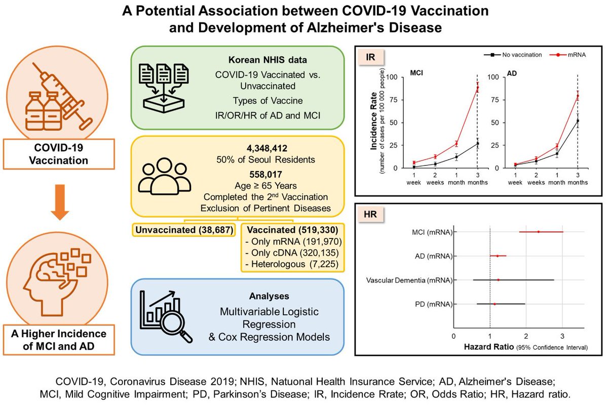 🚨🚨🚨 Japanese Neuroscientist Dr. Hiroto Komano Alarmed at Explosive Dementia Surge Amongst COVID Vaccinated Individuals: Massive Study of ~600,000 Reveals Highlights This paper was recently published. There has been talk about the relationship between dementia and the COVID vaccine, so they investigated this in South Korea. They examined a very large number of people. They examined a very large number of people - 550,000 people. 550,000 people. And they limited it to those who received two doses of the vaccine. And then, after one month, two months, three months, they analyzed all the data. Mild dementia. It's the precursor stage before dementia. It's the precursor stage before dementia. This had doubled. Among vaccinated individuals compared to non-vaccinated individuals. This is significant. And this is after three months. After three months. And the number of people who developed dementia or Alzheimer’s disease increased by over 20%. h/t: @ganaha_masako