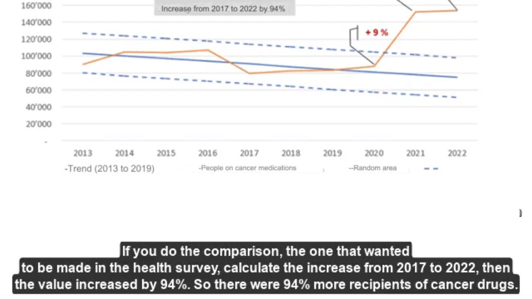 🚨🚨🚨🚨 Whoops! Swiss Federal Office caught manipulating Health Survey but Private Health Insurance data shows a staggering increase of population receiving cancer drugs! "If you do the comparison, the one that wanted to be made in the health survey, calculate the increase from 2017 to 2022, then the value increased by 94%. So there were 94% more recipients of cancer drugs." Professor Dr Konstantin Beck from University of Lucerne raises alarm in his recent presentation. ------------------------------------------------------ Hello everyone, my name is Konstantin Beck, I am a health economist at the University of Lucerne. We are asking the question, how healthy was Switzerland in the year 2022? The reason for this is because in November '23, some publications, official releases appeared that have been partially retracted, which were very differing in their statements and the confusion on this point is somewhat significant at the moment. So, it's about sorting out these different statements. To the fact-checkers online, all statements made here are actually just those of the Federal Office of Public Health, and later of the Helsana insurance, the own calculations are kept within narrow limits. And if you are interested in this type of video, please subscribe and activate the bell so that you are informed when there is a new video as YouTube's algorithms sometimes do not make these videos easily findable. Let's start with the Health Surveys 2022. This is conducted every five years by the Federal Office of Statistics. It receives high attention and is the basis for many scientific studies. And to this, the Federal Office states in its press release on November 3rd, when the health surveys were published, In the year 2022, 85%, so the vast majority of the Swiss population, felt healthy and 83% described themselves as happy. However, more than one-third of Swiss people live with a permanent health problem. However, these health problems cannot have been that great, because at least half of this third describes themselves as happy. The only negative that emerges here is the mental strain, which has increased compared to 2017 and especially in the younger age groups of 15-24-year-olds and there particularly among young women. Then there are a few details on smoking and alcohol consumption. And then, as I said, these are important results of the Swiss Health Surveys 2022 of the Federal Office for Statistics. So, even after the corona pandemic, the Swiss population is predominantly in good health according to their own assessment. This would actually say it all and solve the problem. Now, the surprising thing is that at the same time, in the database of the Federal Office, a statistic with detailed information on the health survey could be found. This was published under the abbreviation given here, and I believe I queried it on November 4th. And there you find answers to the question, have you ever had one of the following three diseases or health problems in your life? The questions were about heart attack, stroke, and cancer. And I will display it right away. What comes next has already been retracted by the Federal Office. But originally it stated that in 2017, approximately 33,000 reports of ever having a heart attack, nearly 28,000 a stroke, and about 117,000 cancer. And when you look at the figures for 2022, it increases to 170,000, 124,000, almost 461,000. So it rises by a factor of 4 to 5. It's a dramatic increase. However, I have corrected that. I calculated how much is due to age. We have immigration as well. Clearly, we have more cancer cases if more people live in Switzerland. But this gives corrections in the range of 2,000 to 9,000 cases. So according to this statistic, we would have a third of a million more cancer cases in Switzerland, than one would expect based on age, sex, and immigration. And quite honestly, if this were the case, and I first believed these data too, they are from the Federal Office, then our cancer care and our cardiac infrastructure would probably be at their limits, if not collapsed. So at the latest by November 14th, at that time I realized this, you could no longer call up these numbers. The Federal Statistical Office erased the data for 2017 with the note that the health surveys of 2017 and 2022 are not comparable. No more information was provided. One had to inquire back. So if you have such a severe error, then it would perhaps be better or desirable that the error would be communicated better. Upon inquiry, it was then found out that in 2017 the question was, did you have any of the following diseases last year? And in 2022 the question was, have you ever had any of the following diseases or health problems in your life? Of course, that's a huge difference. Many people who didn't have a problem last year may have had the problem over the last few years. So understandable that then the second number will be larger than the first and also understandable that they are no longer comparable. Not quite comprehensible, why you would change this question and thereby torpedo the comparability. Another argument, I won't go into it in so much detail now, is that the significance in many sub-evaluations was not given and they therefore wanted a larger sample, more 'yes' answers. Those are technically convincing arguments. But when you know that these are very sensitive questions because the vaccine critics expect that the negative impact of the vaccination could be shown and then just these data are first published to the institution and then retracted, it does not contribute to the trust in the Federal Office, unfortunately. Well, there remain open questions. Why was the obviously wrong comparison published? How did it even come about that the office, even though the difference is known, why did the office refrain from a detailed error communication, as I have already said? But why also does the press release of the Federal Office contrast so greatly wit