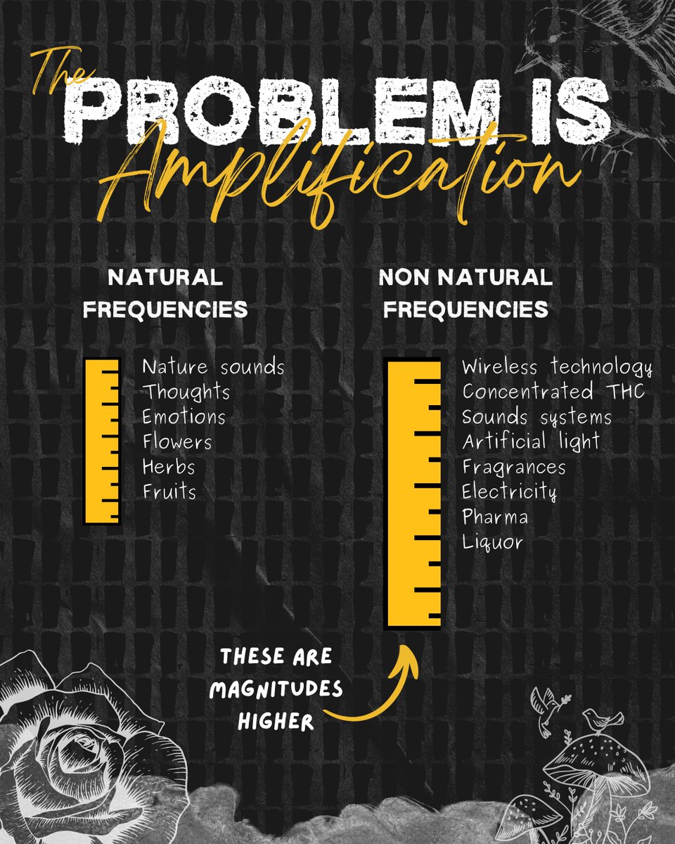 Did you know that your brain operates between... .05Hz and ~40Hz Wi-Fi Operates at 2.4 to 5Ghz This is... 24 to 50 Million times higher. A rose emits .5 to 1.5 parts per billion in VOCs. Do you know how much higher perfume is? One hundred and fifty million times higher. Everyone is short circuiting... β₯ Mentally β₯ Spiritually β₯ Physically β₯ Emotionally Because the system is overloaded. Every machine you can thinking of... Where you run millions of times more power through it than it is used to... Will break. β₯ Engines β₯ Batteries β₯ Computers One of the many root causes of dysfunction is... Amplification. You'll see a night and day difference if you bring back homeostasis to your life. β₯ Candles > Lights β₯ Wired > Wireless β₯ Incandescent > LEDs β₯ Essential Oils > Perfumes β₯ Homeopathic > Allopathic β₯ Natural fibers > Synthetic fibers Reduce the amplification.